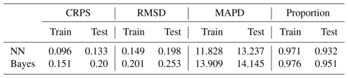 A smaller CRPS value signifies a closer alignment of the model's probability distribution with actual observations, integrating insights on both the shape and the location of the distribution and demonstrating sensitivity to outliers. Unlike other metrics, such as root mean square error (RMSE) or mean absolute error (MAE), CRPS offers a more holistic evaluation of a probability distribution's predictive capacity by considering the full distribution shape. For Bayesian and neural network models, comparing CRPS values facilitates an understanding of their proficiency in fitting the entire probability distribution.