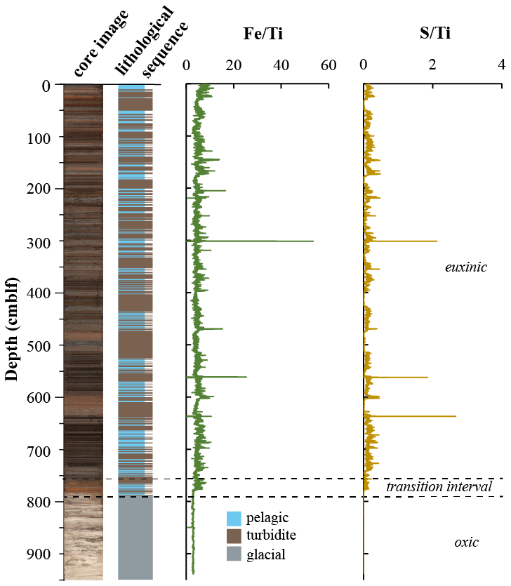 The complete sedimentary sequence from Lake Cadagno is approximately 950 cm long, covering a period of  13.5 kyr (Berg et al., 2022). Sediments are characterized by relatively fine-grained pelagic lacustrine sediments intercalated with frequent coarser-grained flood- and mass movement-derived deposits containing remobilized littoral lake and terrestrial sediment in the upper 790 cm, underlain by light-colored fine-grained deposits of late glacial origin (Fig. 1). The sediment can thus be divided into three distinct lithostratigraphic units representing an early oxic lake (950–790 cm; 13.5 to 12.5 kyr), a redox transition interval (790–760 cm; 12.5 to 10.9 kyr), and the euxinic period (above 760 cm; 10.9 kyr to present). High-resolution mapping of element geochemistry on split core surfaces (Fig. 1) reveals that the accumulation of sulfur is restricted to sediments deposited after the onset of periodic anoxia (transition interval) to permanently reducing conditions (euxinic interval). Fe and S were normalized against Ti, which represents the lithogenic fraction unaltered by redox processes in the aquatic environment. The correlation between S / Ti and Fe / Ti suggests the presence of authigenic iron sulfide phases. The largest S excursions are located at 300, 560, and 637, which correspond to lacustrine deposits according to the lithological sequence.