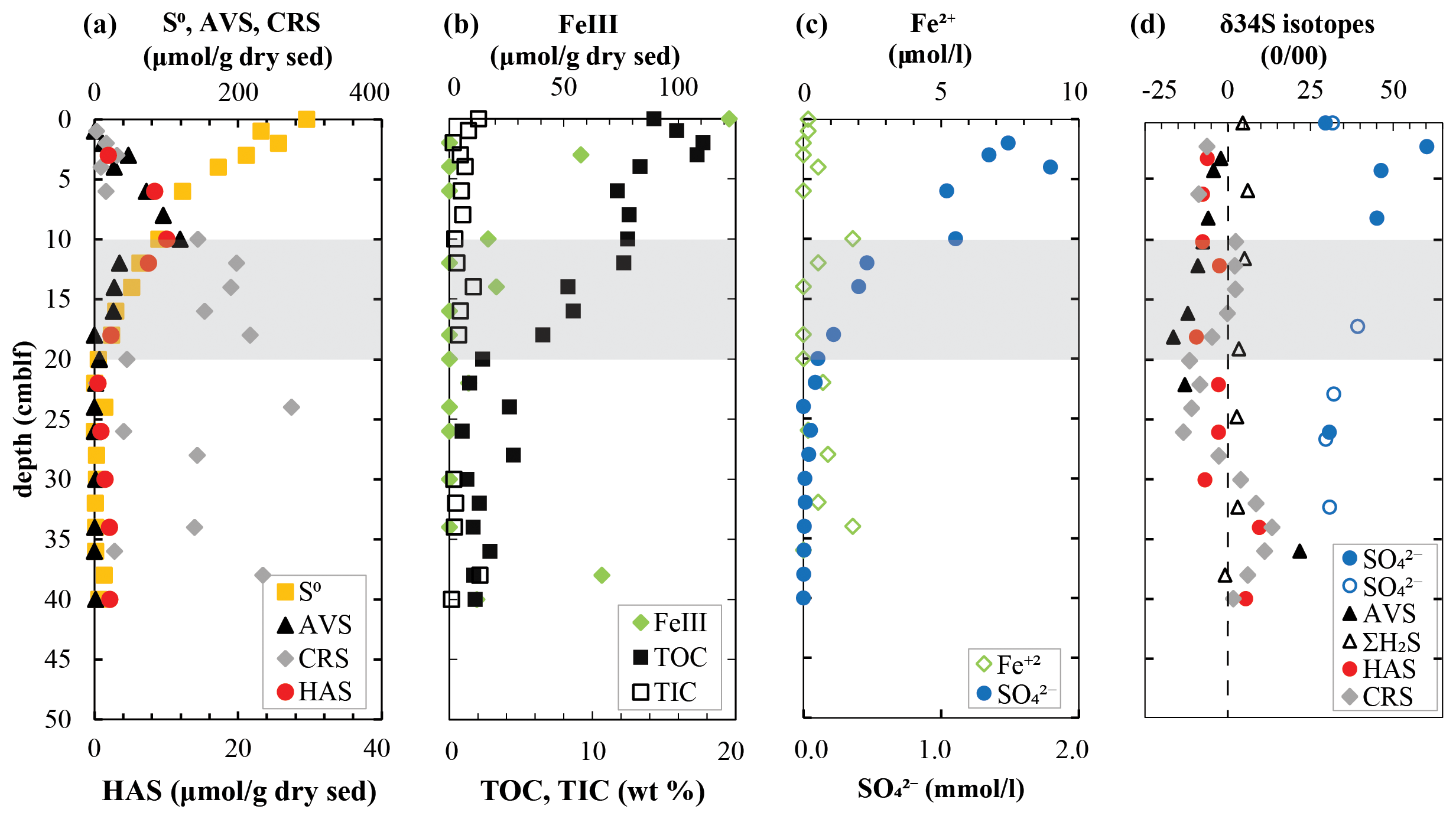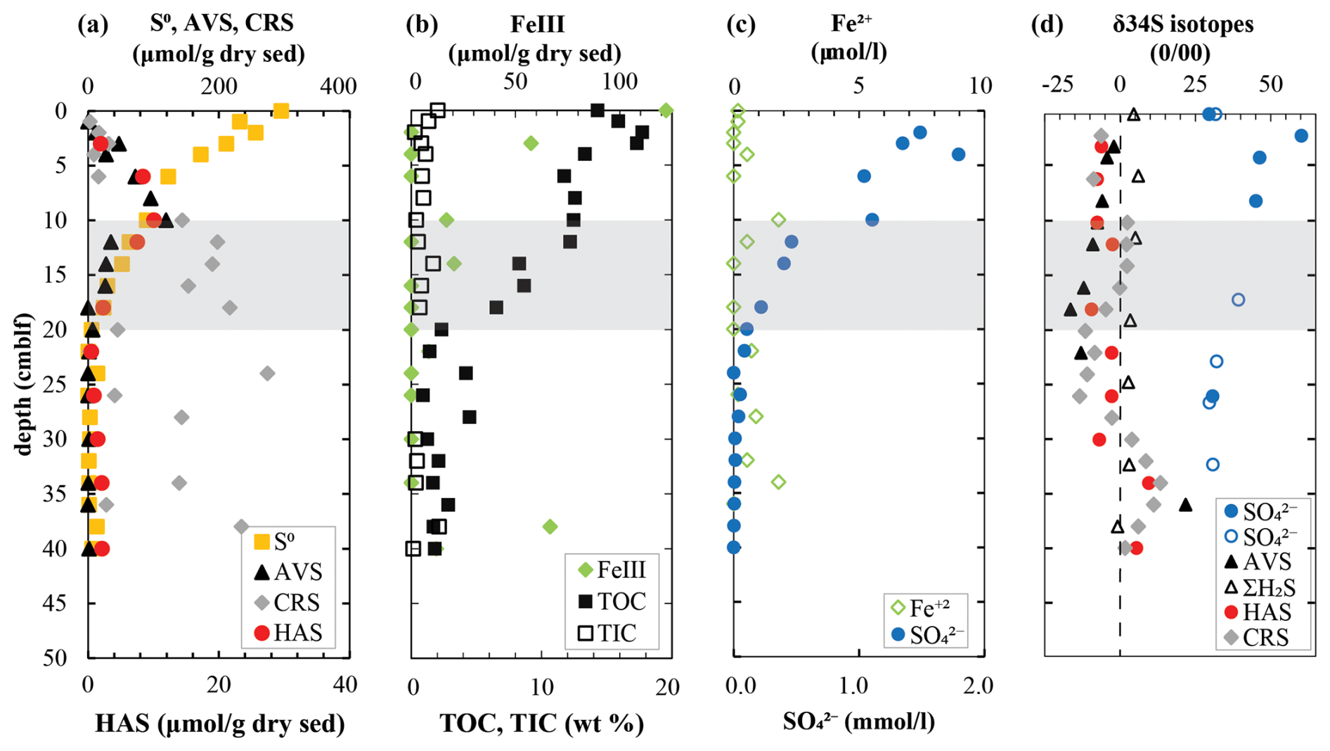 To obtain further insights into sulfur redox cycling in these sediments, major solid sulfur phases were quantified (Fig. 2a). Elemental sulfur (S0) is the most abundant solid sulfur phase in surface sediments at 300 µmol g−1 dry sediment. The parallel decrease in S0 and FeIII (Fig. 2b) with depth indicates increasingly reducing conditions. Both AVS (mostly amorphous FeS and mackinawite) and HAS exhibit a peak at 10 cm depth, which coincides with a peak in dissolved Fe2+ and the steepest decrease in sulfate concentrations (Fig. 2c). Below this depth, AVS, HAS, and S0 decrease in parallel with sulfate at the expense of CRS formation. Most carbon is in organic form in the Lake Cadagno sediments, with measurable contributions (< 2 wt %) of total inorganic carbon (TIC) present only in the top few centimeters and again at 14 cm depth (Fig. 2b).