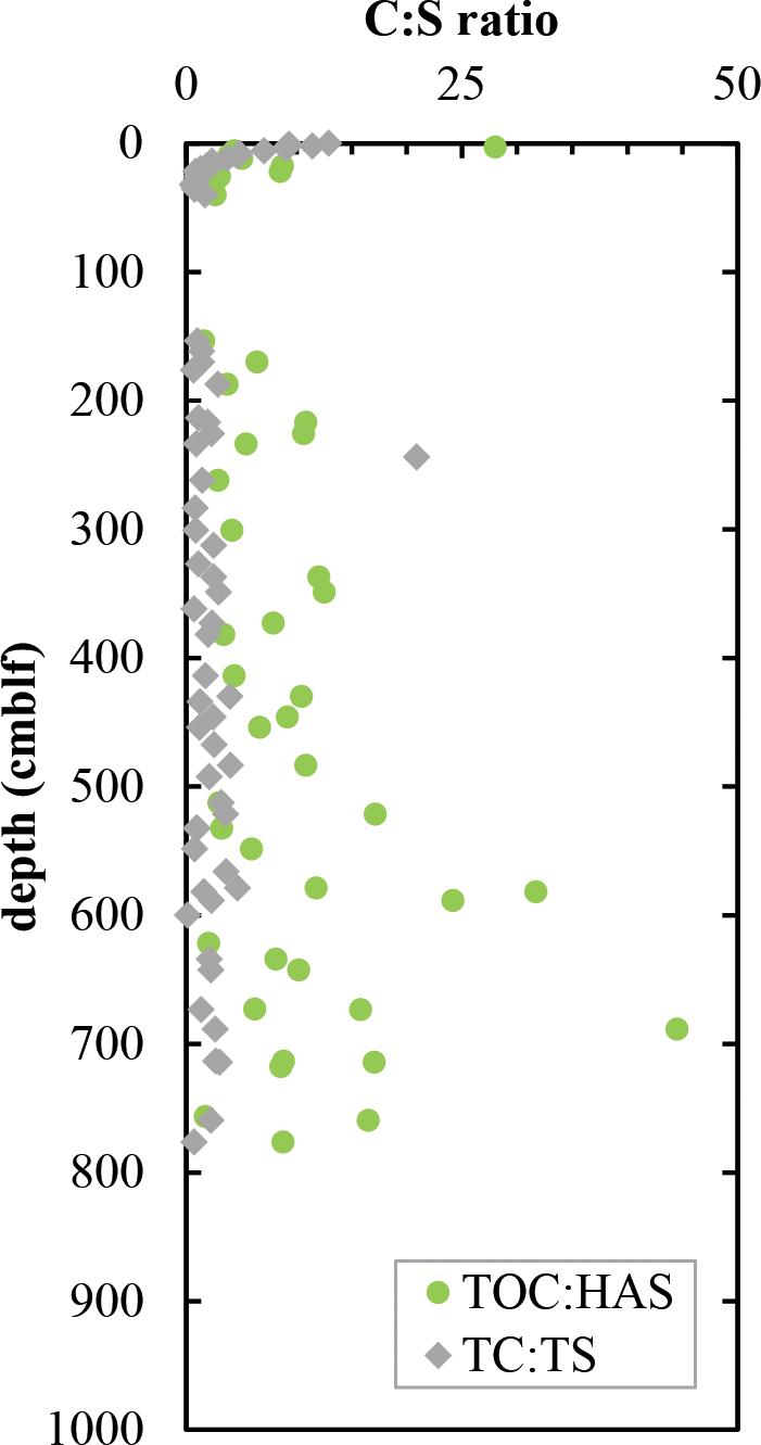 C to S ratios of organic matter are expected to decrease when sulfide reacts with organic matter to form organic S or when microorganisms preferentially degrade organic carbon and leave behind organic S. TC : TS decreases from 12 at the surface to about 1.3 at 20 cm depth and remains relatively constant throughout the deeper sediments (Fig. 4). Most of this carbon is in organic form, with measurable contributions of total inorganic carbon (TIC) present only in surface sediment and again at 400 cm depth (< 2 wt %; Fig. 2b). The apparent outlier at 243 cm is due to very low sulfur concentrations measured in this sample. A part of the total organic sulfur could be measured as HAS, and the ratios of TOC : HAS exhibit a decrease from the surface to 25 cm depth (Fig. 4). Below 150 cm depth, ratios of TOC : HAS fluctuate widely, following the same trend as TOC (r2= 0.31) with an even stronger correlation (r2= 0.81) among terrestrial sediments only. In fact, there is a significant difference (p< 0.0001) in TOC : HAS ratios between sediment layers of lacustrine and terrestrial origin (Student's t-test).