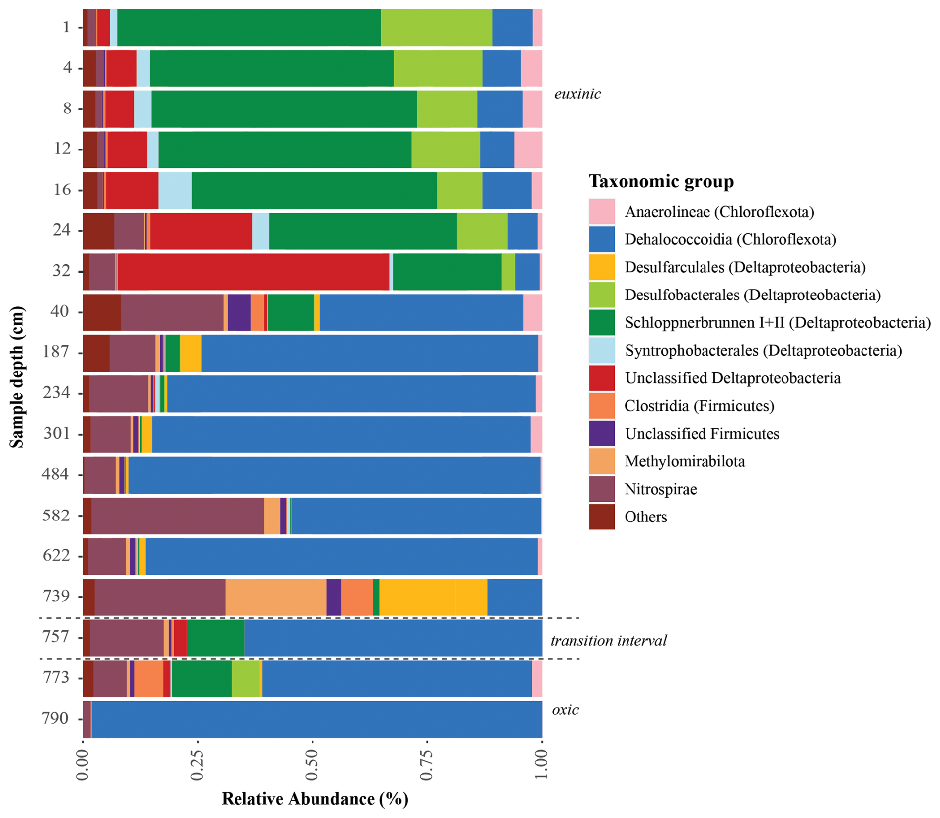 Figure 6Taxonomic classification of functional genes dsrB recovered from the Lake Cadagno sediment depths. Sediment geological transitions are indicated with dashed lines.