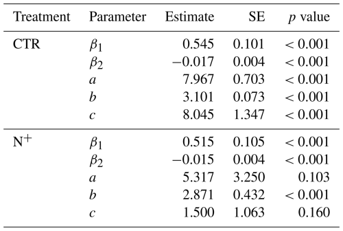 Parameters and fit statistics for the NLS regression model are provided in Tables 1 and 2. In CTR, the Ricker power parameter c significantly differed from 1, indicating suppressed respiration under nonoptimal SWC conditions. The model parameters describing functional dependencies on soil moisture were statistically different from 0 for CTR but not for N+ (Table 1). While not statistically different from 0 in N+ plots, a c value near 1 suggests a relatively flat response of Rh/SOC to SWC. In contrast, a high c value (≈8, p<0.001) in CTR plots indicates a peaked moisture response, supporting a stronger effect of moisture limitation on decomposition under ambient conditions (Table 1). Neither the CTR nor N+ models showed bias (Table 2 and Table S1 in the Supplement). NLS model fit metrics showed that the R2, RMSE, MBE, and MAE values were comparable between CTR and N+ models (Table 2). RMSE and MAE for NLS models fell within the range of standard deviations from 10-fold cross-validation (Table S1). The model accuracy was generally higher in N+ than in CTR plots (Table 2).