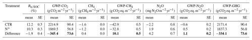 Table 3Annual global warming potential (GWP) reduction by long-term N fertilization in a boreal Scots pine forest with the contribution of individual greenhouse gas (GHG) fluxes (microbial respiration normalized by soil organic carbon stock Rh/SOC, CH4 net oxidation, and N2O flux net exchange) evaluated as the difference between control (CTR) and N-fertilized (N+) plots. Minus values indicate net GWP reduction. The AR6 GWP-100 values of 27 for CH4 and 273 for N2O were used for the calculation of CO2 equivalents (IPCC, 2023). SE values were calculated considering variations across replicates and years together. Total GWP differences are marked in bold.