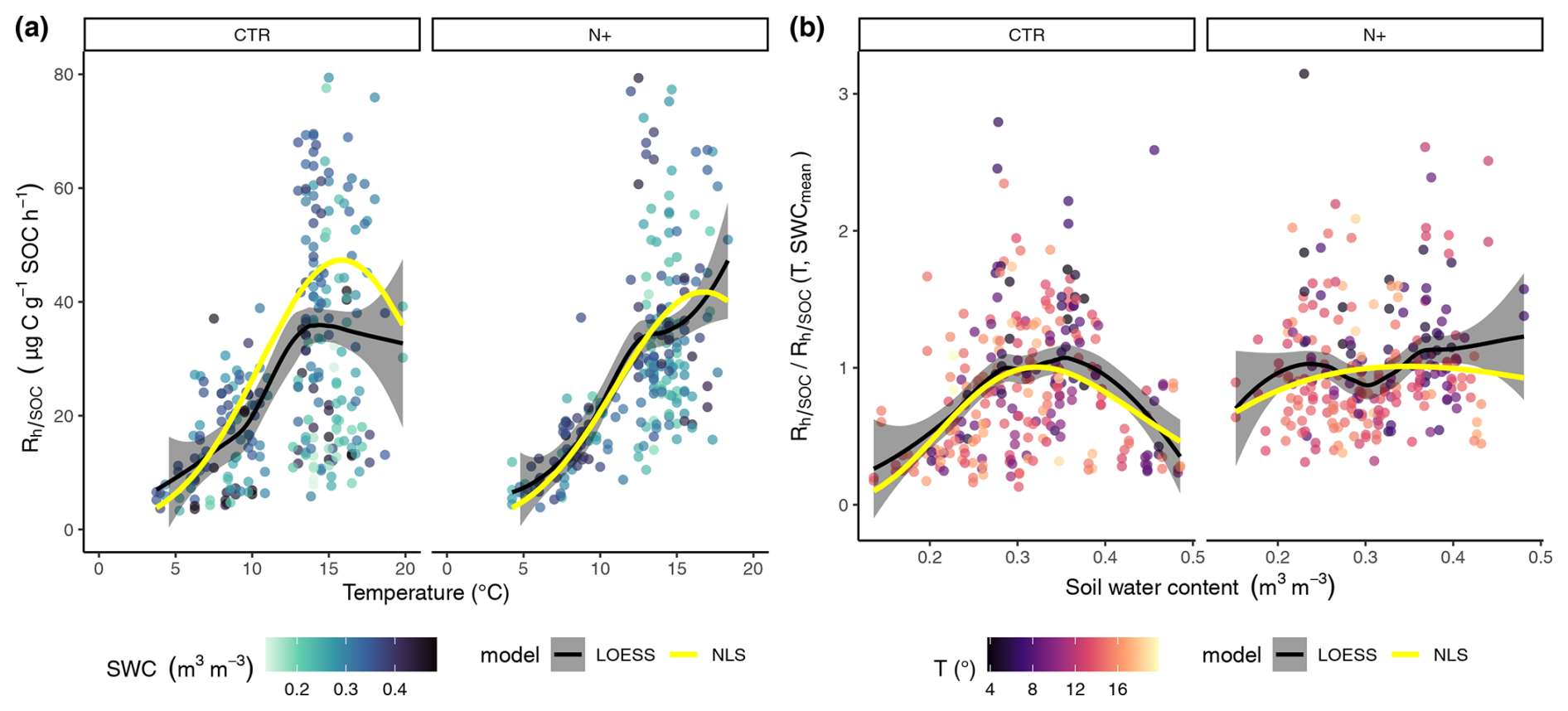 LOESS and NLS regression models showed similar Rh/SOC dependencies on T and SWC (Fig. 4a and b). In CTR and N+, NLS models indicated a T optimum at 15.8 and 16.8 °C, respectively, above which decomposition was limited by dry soil conditions. Thus, Rh/SOC in CTR at T values below the optimum rose more steeply compared to N+ plots (Fig. 4a).