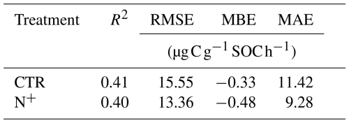 Table 2Goodness-of-fit statistics for NLS models based on combined temperature and moisture (Eq. 1): proportion of explained variance (R2), root-mean-square error (RMSE), mean bias error (MBE), and mean absolute error (MAE) (all in µgCg-1SOCh-1).