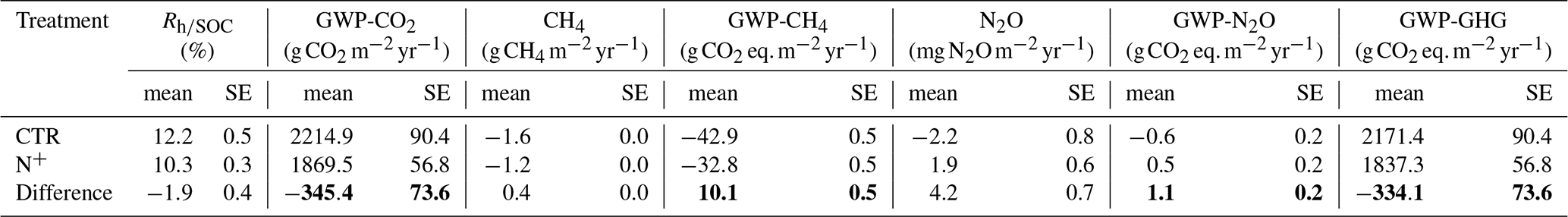 Table 3Annual global warming potential (GWP) reduction by long-term N fertilization in a boreal Scots pine forest with the contribution of individual greenhouse gas (GHG) fluxes (microbial respiration normalized by soil organic carbon stock Rh/SOC, CH4 net oxidation, and N2O flux net exchange) evaluated as the difference between control (CTR) and N-fertilized (N+) plots. Minus values indicate net GWP reduction. The AR6 GWP-100 values of 27 for CH4 and 273 for N2O were used for the calculation of CO2 equivalents (IPCC, 2023). SE values were calculated considering variations across replicates and years together. Total GWP differences are marked in bold.