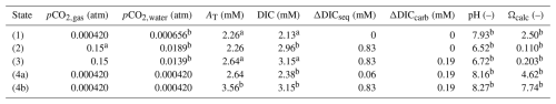 Table 1Theoretical values for process water pCO2 (pCO2,water), alkalinity (AT), dissolved inorganic carbon (DIC), pH, and calcite saturation state (Ωcalc) in the four consecutive states of the example AWL reactor: (1) the process water that is used as intake (the process water was collected from an offshore station near the Hoping power plant and the inlet and outlet of the cooling water drainage of the Hoping power plant, Chou et al., 2015), (2) the process water with elevated DIC after CO2 uptake, (3) the process water enriched in AT and DIC after CaCO3 dissolution, and (4a) the unbuffered or (4b) buffered process water upon discharge. ΔDICseq is the DIC that is added to the process water due to dissolution from the gas stream, and ΔDICcarb is the DIC added through the dissolution of CaCO3 in the reactor. The pCO2,gas, AT, and DIC values (indicated by a) are based on values measured in a two-step AWL bench-top reactor (Chou et al., 2015). The values of pCO2,water, AT, DIC, pH, and Ωcalc (indicated with b) are calculated using CRAN AquaEnv (Hofmann et al., 2010) for seawater at a temperature of 15 °C and salinity of 35.