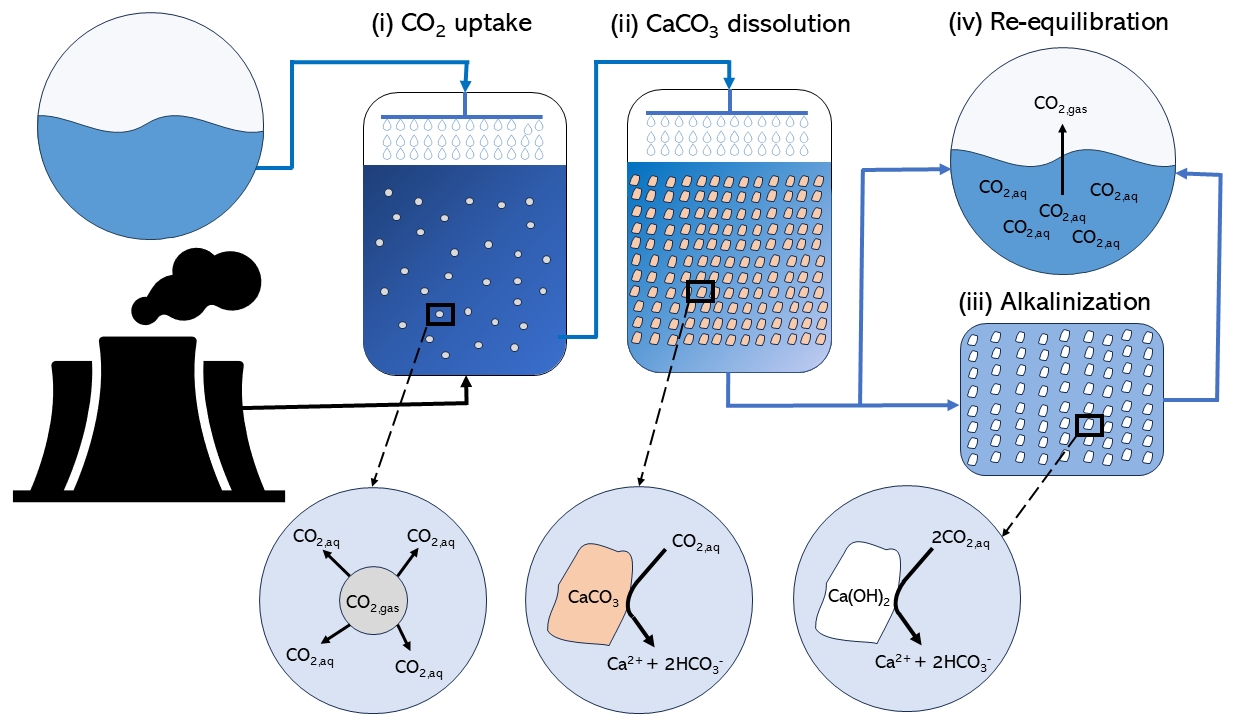 Accelerated weathering of limestone (AWL) is a CO2 emission mitigation technology that aims to artificially increase the weathering rate of CaCO3 (Rau and Caldeira, 1999). The AWL process consist of four main steps: (i) the CO2 uptake step, (ii) the CaCO3 dissolution step, (iii) the alkalinization step (for buffered AWL), and (iv) the re-equilibration step.