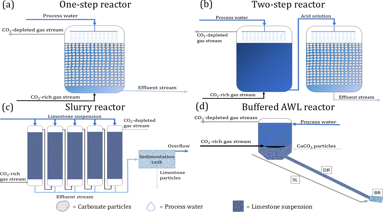 Since the first AWL reactor design proposed by Rau and Caldeira in 1999 (Rau and Caldeira, 1999), laboratory experiments and pilot-scale operations have optimized the CO2 uptake efficiency and reduced resource consumption. Nevertheless, large quantities of water are still needed for the dissolution of CaCO3, while degassing of CO2 after contact of the effluent with the atmosphere limits the CO2 sequestration efficiency. The concept of buffered AWL, as proposed by Caserini et al. (2021), reduces the water requirements and increases the CO2 sequestration efficiency by adding an extra Ca(OH)2 buffering step. This additional step however comes at a CO2 penalty, as conventional production of Ca(OH)2 emits CO2.