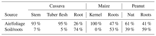 Foliage, stem, grains/tubers, and root samples of three crops cultivated at both Farm1 and Farm2 were collected: maize (Zea mays), cassava (Manihot esculenta), and peanuts (Arachis hypogaea). We note that, in cassava, tubers are true roots, but we classify “roots” as undeveloped (no tuber) adventitious roots/rootlets (Rees et al., 2012). Cassava and maize were nearing maturity at the time of sampling and  1–2 months (or less) before harvest, while peanuts were fully mature and being harvested at the time of sampling. Three whole plants of each crop at each farm were removed from the soil for sampling, with care taken to consolidate belowground tissues with each selected plant. Due to sampling availability and access restrictions placed by farmers, the community, and mine owners, we could not deviate from this sample timing (and quantity). Full details of crop sampling procedures are provided in Sect. S2.