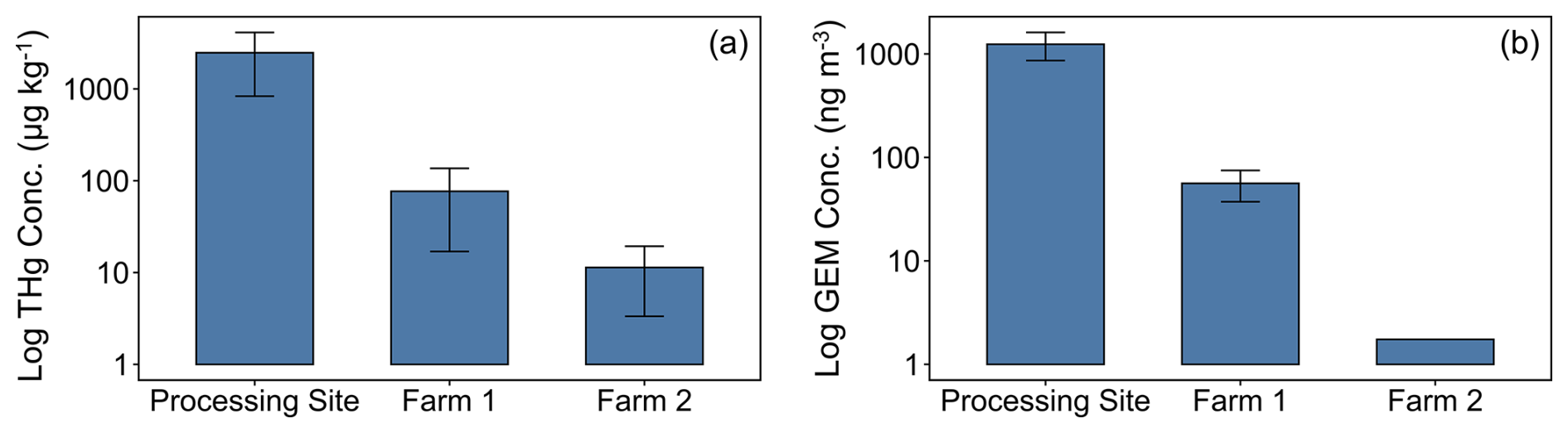 Highly elevated GEM concentrations (1200 ± 400 ng m−3) were observed at the ASGM processing site (PS) (Fig. 2). These concentrations are  1000× background concentrations and consistent with levels observed in other ASGM regions where Hg is used in ASGM activities (González-Carrasco et al., 2011; Kawakami et al., 2019; Nakazawa et al., 2021; Snow et al., 2021) and indicate substantial Hg use and emissions at the PS. At Farm1 ( 500 m distance from the PS), GEM concentrations were significantly lower than at the PS (p= 0.014) but remained elevated (54 ± 19 ng m−3) above background, confirming exposure of Farm1 to GEM emissions from ASGM activities at the PS. In contrast, GEM concentrations at Farm2 (1.7 ng m−3, n=1 ) were consistent with the Northern Hemisphere background concentrations ( 1.5–2 ng m−3; Sprovieri et al., 2016).