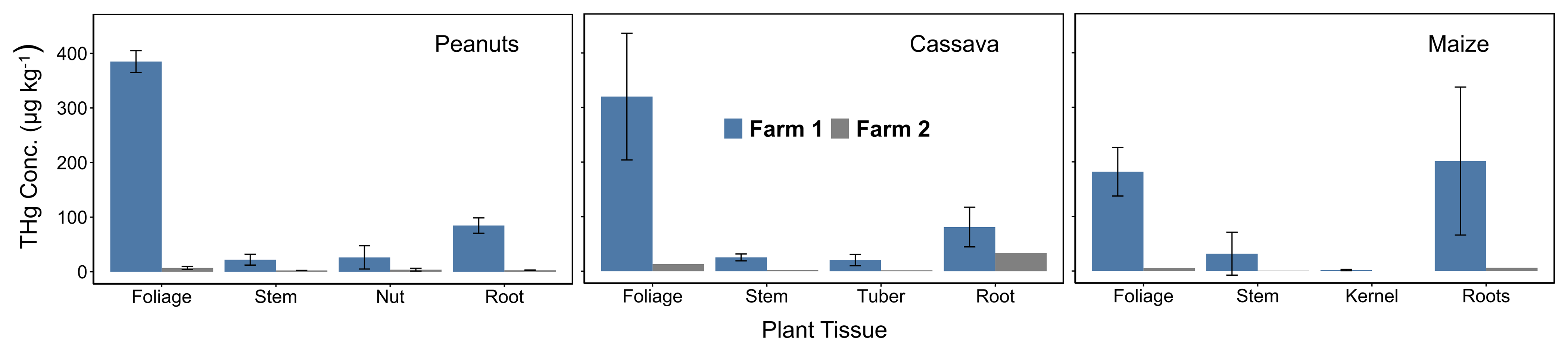 Similar results showing the highest crop tissue THg concentrations in ASGM-affected farms are common in the literature (i.e. cassava in Golow and Adzei, 2002; cassava in Nyanza, et al., 2014; and soy (Glycine max) in Casagrande et al., 2020). However, we note the challenges of comparing absolute THg concentrations even of samples from the same species, as the distance from ASGM activities is likely a major determinant controlling observed levels of crop contamination, and, in many cases, little specific information on source–receptor distances is provided (i.e. Essumang et al., 2007; Adjorololo-Gasokpoh et al., 2012; Nyanza et al., 2014).