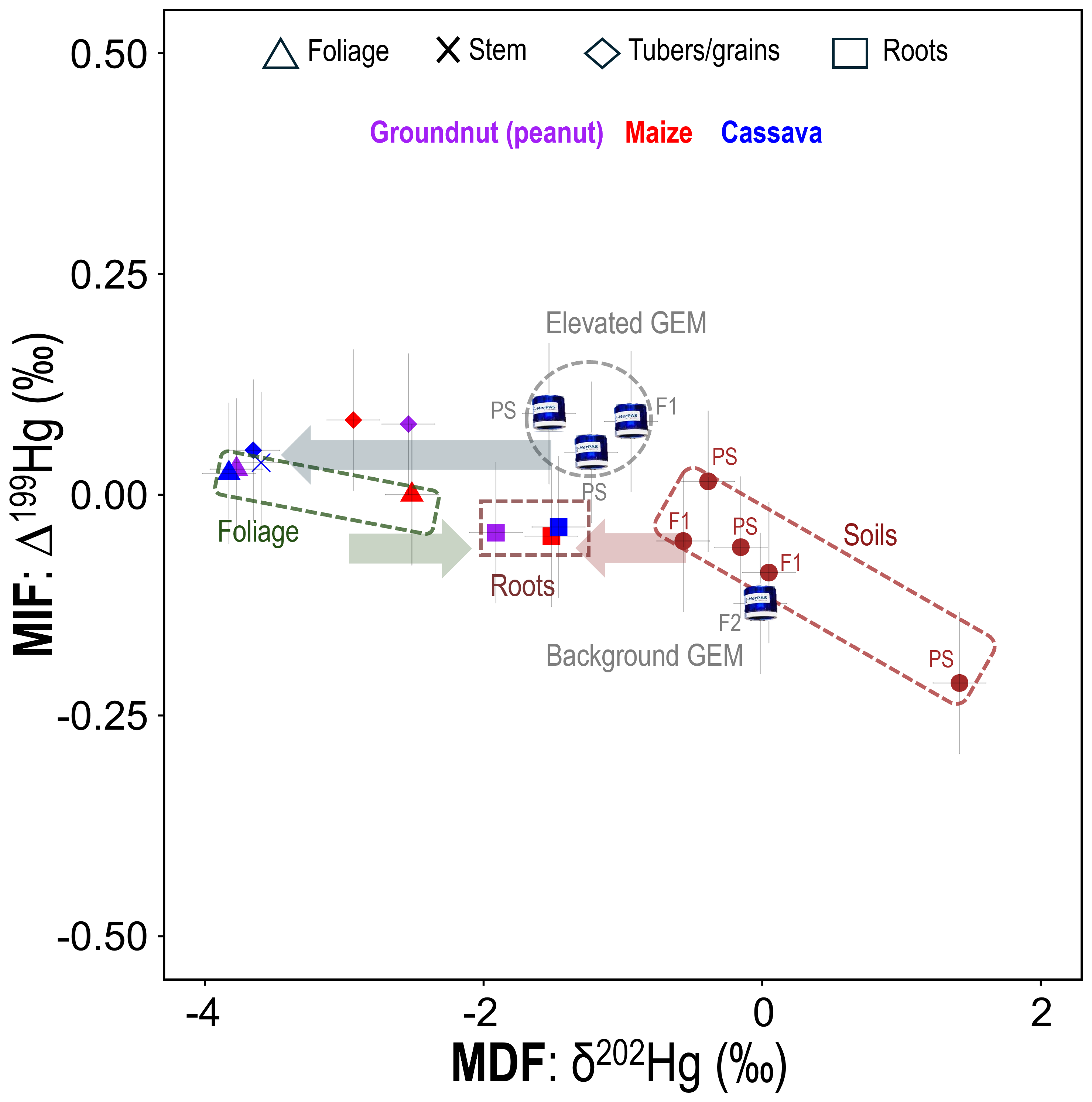 Hg stable isotope data for other crop tissues provided further evidence of translocation of Hg away from foliage. Due to the lower concentration and limited available sample, stems could only be analysed for stable isotopes in cassava, and this one sample displayed almost identical MDF and MIF signatures to cassava foliage (93 % derived from air/foliage; Table 1). Edible parts of maize (kernel; 100 % from air/foliage) and cassava (tuber flesh; 95 % from air/foliage) displayed similar patterns (Table 1). Studies on cassava in ASGM regions, such as those by Nyanza et al. (2014), have similarly demonstrated that Hg concentrations in cassava tubers remain low even in highly contaminated soils, emphasizing the influence of foliar pathways. This contrasts with the common assumption that tubers accumulate Hg mainly through soil uptake (Adjorlolo-Gasokpoh et al., 2012).