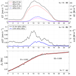 For the wDry daytime data, the comparison between VOD and fd with ET is less clear. The VOD and fd results imply that the canopy evaporation of intercepted water was nearly linear with time from the early-morning (nocturnal) hours up until the time that the intercepted water was completely (or mostly) evaporated, at around 14:00 MST. This would mean that the morning sunrise (i.e., increases in Rnet, transpiration, and air temperature) had a minimal effect on canopy evaporation. In contrast, between around 06:00–10:00 MST, 21.5 m ΔET increased from a value of around 0.02 to around 0.08 mm h−1 (Fig. 6b). A portion of this increase can be explained by increased ground evaporation starting just after 08:00 MST. However, the increase in 21.5 m ΔET between 06:00 and 08:00 MST is inconsistent with the VOD/tree sway measurements, which suggest the canopy evaporation was fairly constant during that period. One possible explanation for the increase in ΔET between 06:00 and 08:00 MST is that transpiration between dDry and wDry days is not the same. However, previous work at the US-NR1 site has suggested that transpiration is similar on dDry and wDry days (Burns et al., 2015) and tree-to-tree variability from the 2007 sap flow data of Hu et al. (2010) was small (Fig. S11b–d).