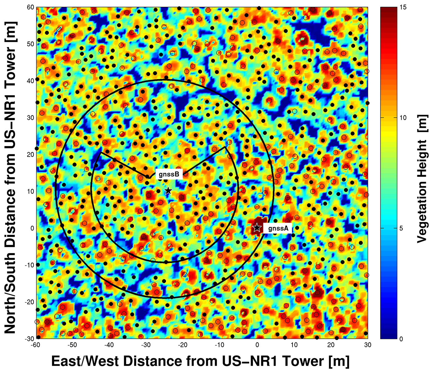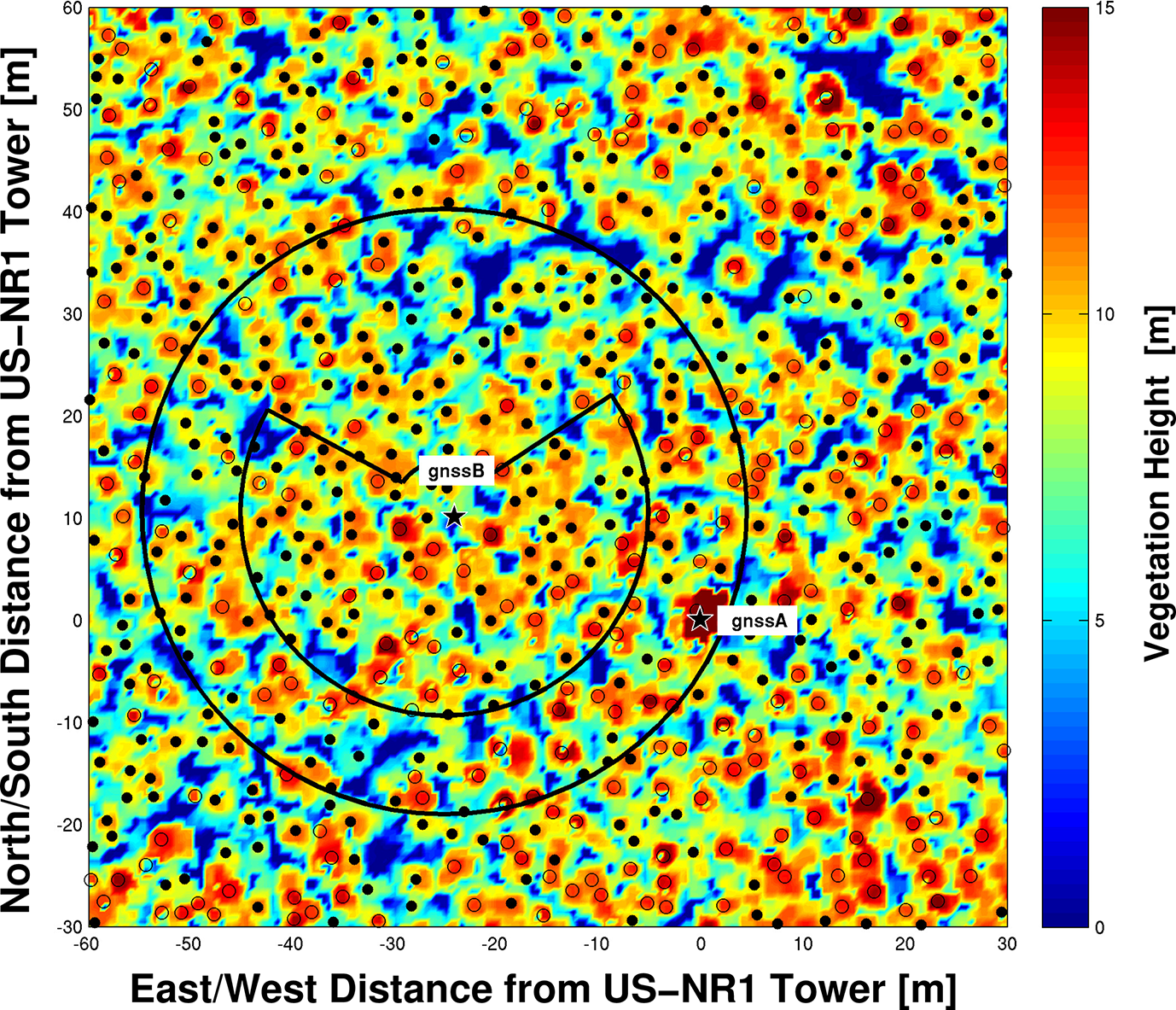 Figure 1The locations of the two GNSS antennas (gnssA and gnssB) are shown as stars on a 90 m × 90 m map relative to the location of the US-NR1 26 m tower. The gnssA antenna is at the top of the US-NR1 tower and gnssB is located in the forest 1.27 m above the ground on a tripod. The background colors show vegetation heights calculated from airborne lidar data within 0.5 m × 0.5 m regions. The filled circles indicate tree locations that are shorter than 12 m, and open circles indicate trees taller than 12 m. The outer black circle around gnssB shows the VOD footprint area with a radius of ≈ 30 m, while the inner black circle shows an alternate VOD footprint based on examination of the sky plot shown in Fig. S3. The VOD footprint is further discussed in Appendix B.