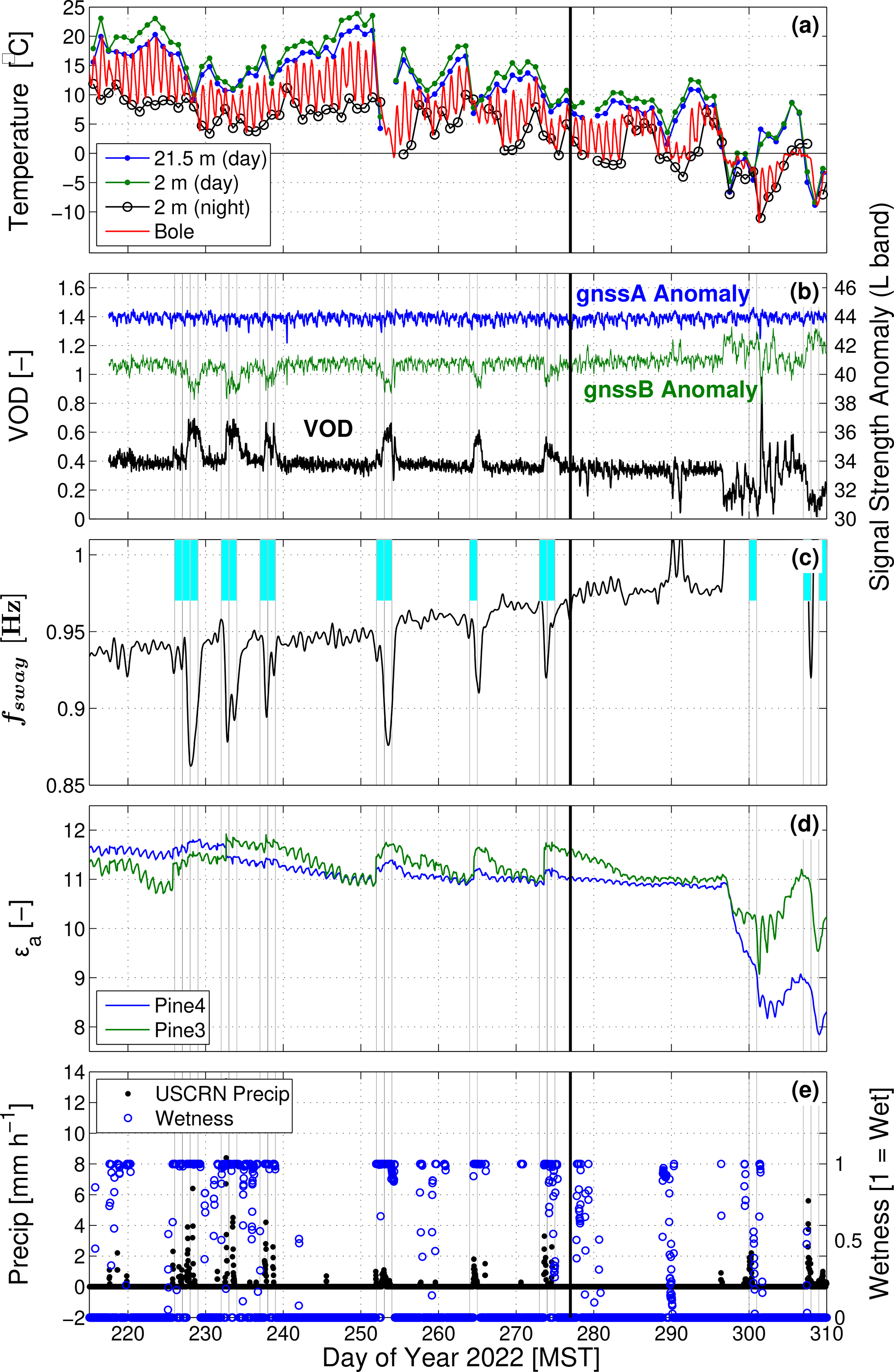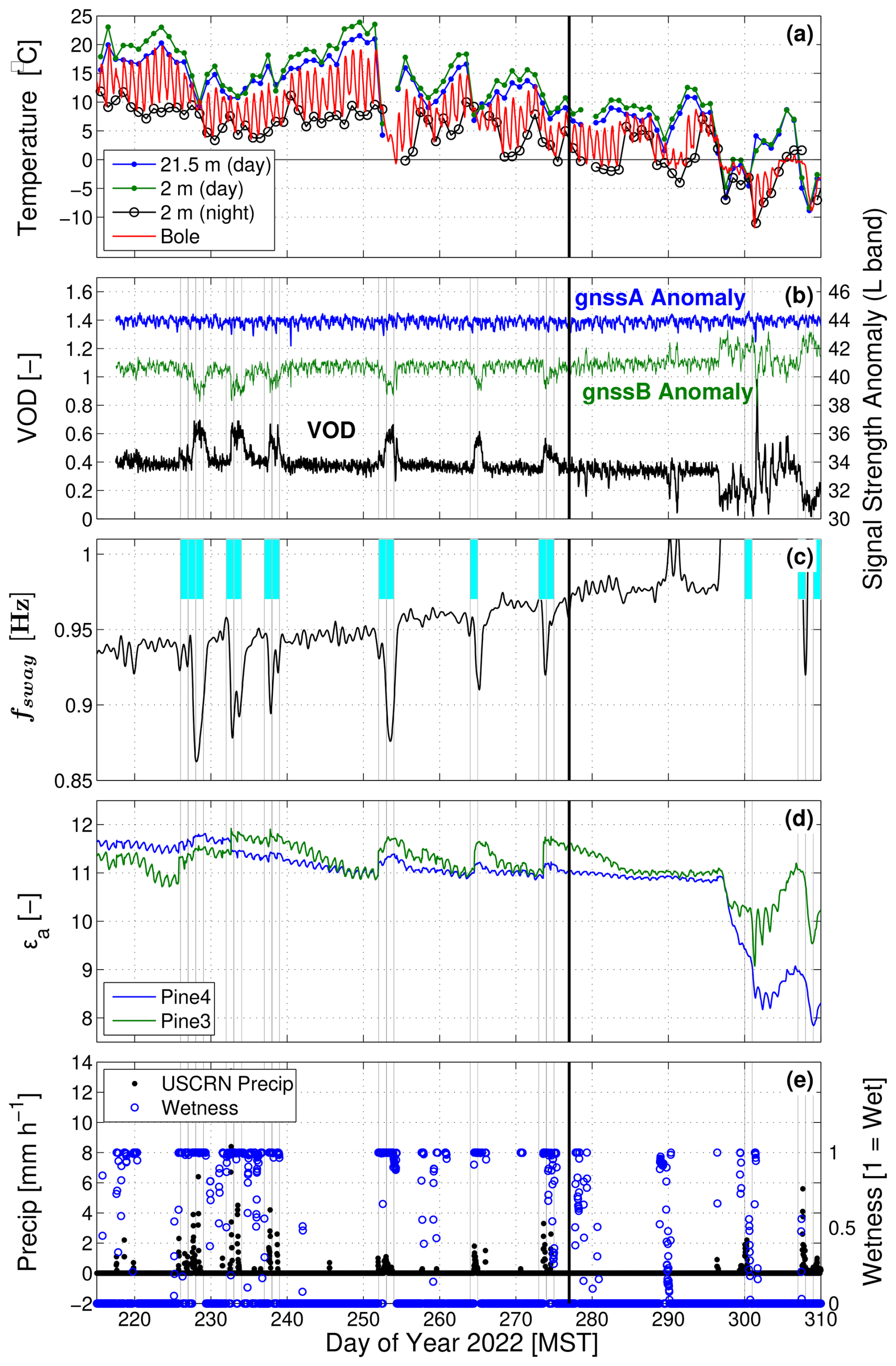 Figure 2Time series from 2022 of (a) midday (10:00–14:00 MST) air temperature Ta at 21.5 and 2 m heights, nighttime (22:00–02:00 MST) 2 m Ta, and 30 min bole temperature (at 12 mm depth). (b) GNSS-based vegetation optical depth (VOD) and signal strength anomalies, (c) tree sway frequency fsway, (d) apparent dielectric permittivity εa, and (e) precipitation and surface wetness. VOD and εa are both dimensionless as indicated by “[–]”. The thin vertical black lines and filled blue periods in panel (c) indicate when wet days occurred. The thicker vertical black line at day of year 277 indicates the cut-off date of our study.