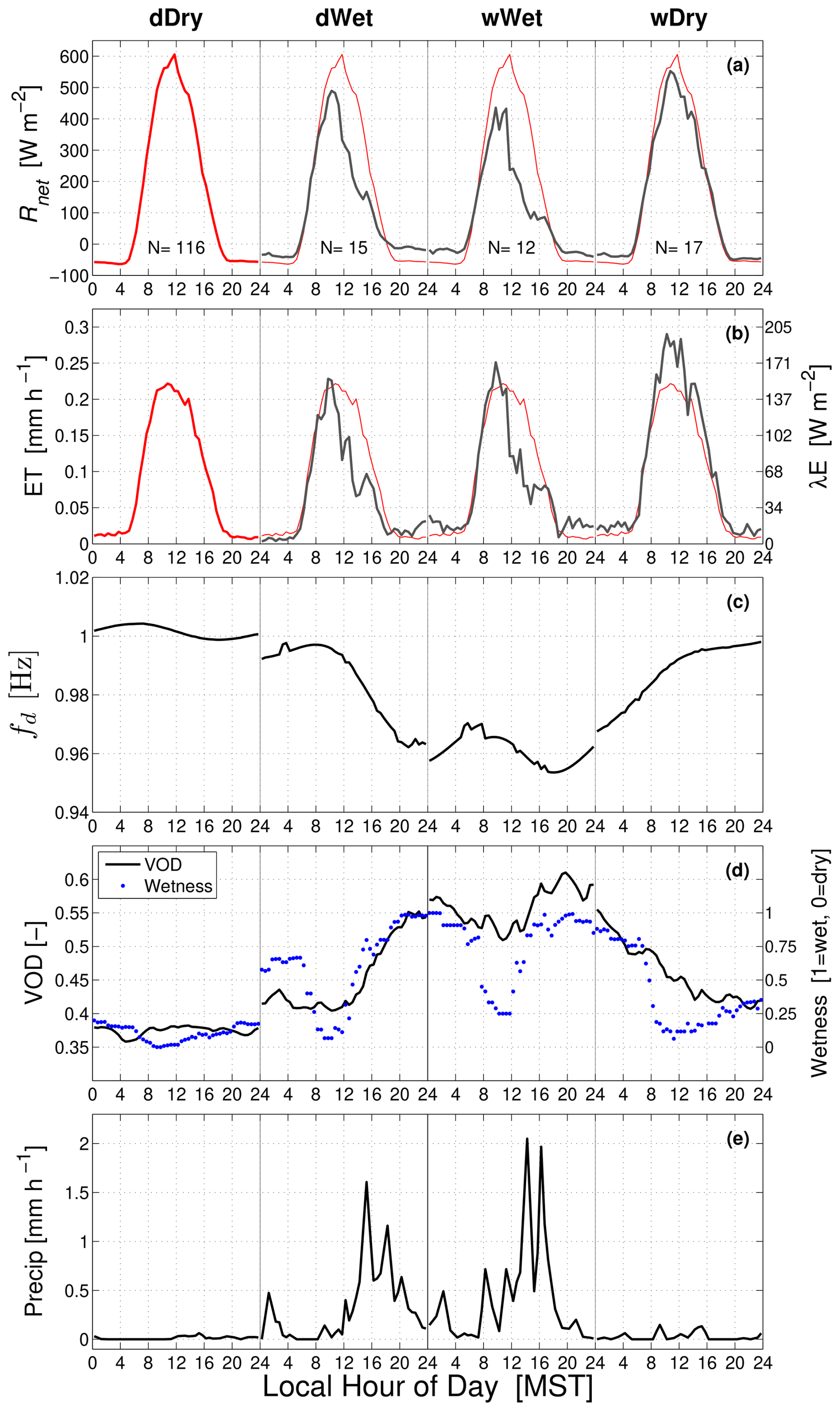 Figure 3The warm-season mean composite diel cycle of (a) net radiation Rnet, (b) evapotranspiration (ET), (c) detrended tree sway frequency fd, (d) vegetation optical depth (VOD) and wetness, and (e) precipitation for each precipitation state (dDry, dWet, wWet, and wDry) where the precipitation state for each diel cycle is identified above panel (a) and separated by thin vertical black lines. In panels (a) and (b), the dDry diel cycle is repeated in the dWet, wWet, and wDry states as a red line. The right axis of panel (b) shows ET as latent heat flux with units of W m−2. λE. The diel cycle is calculated from 30 min measurements during the warm season for August–October 2022 and June–August 2023, and the approximate number of days (N) used to create each composite is shown in panel (a). More information on the measurements, precipitation state, and data compositing is within the text.