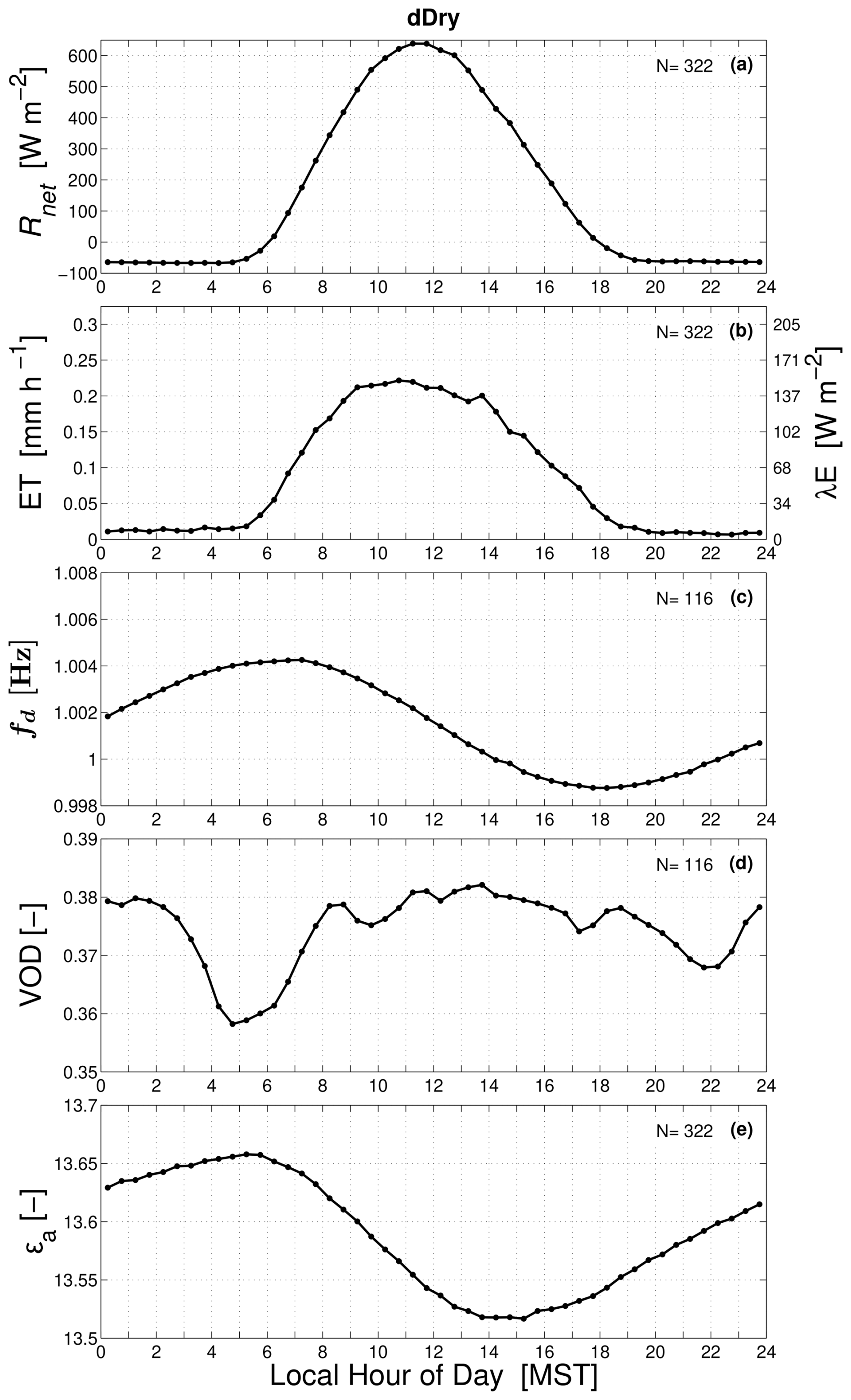 Figure 5The warm-season mean composite diel cycle of (a) net radiation Rnet, (b) evapotranspiration (ET) (and latent heat flux λE), (c) detrended tree sway frequency fd, (d) vegetation optical depth (VOD) and wetness, and (e) apparent dielectric permittivity εa for dDry conditions. In panels (a)–(b) and (e), the results are from the years 2018–2021 (N = 322 dDry days), while in panels (c) and (d) the results are from the years 2022–2023. For clarity, each panel lists the average number days (N) used to create the composite.