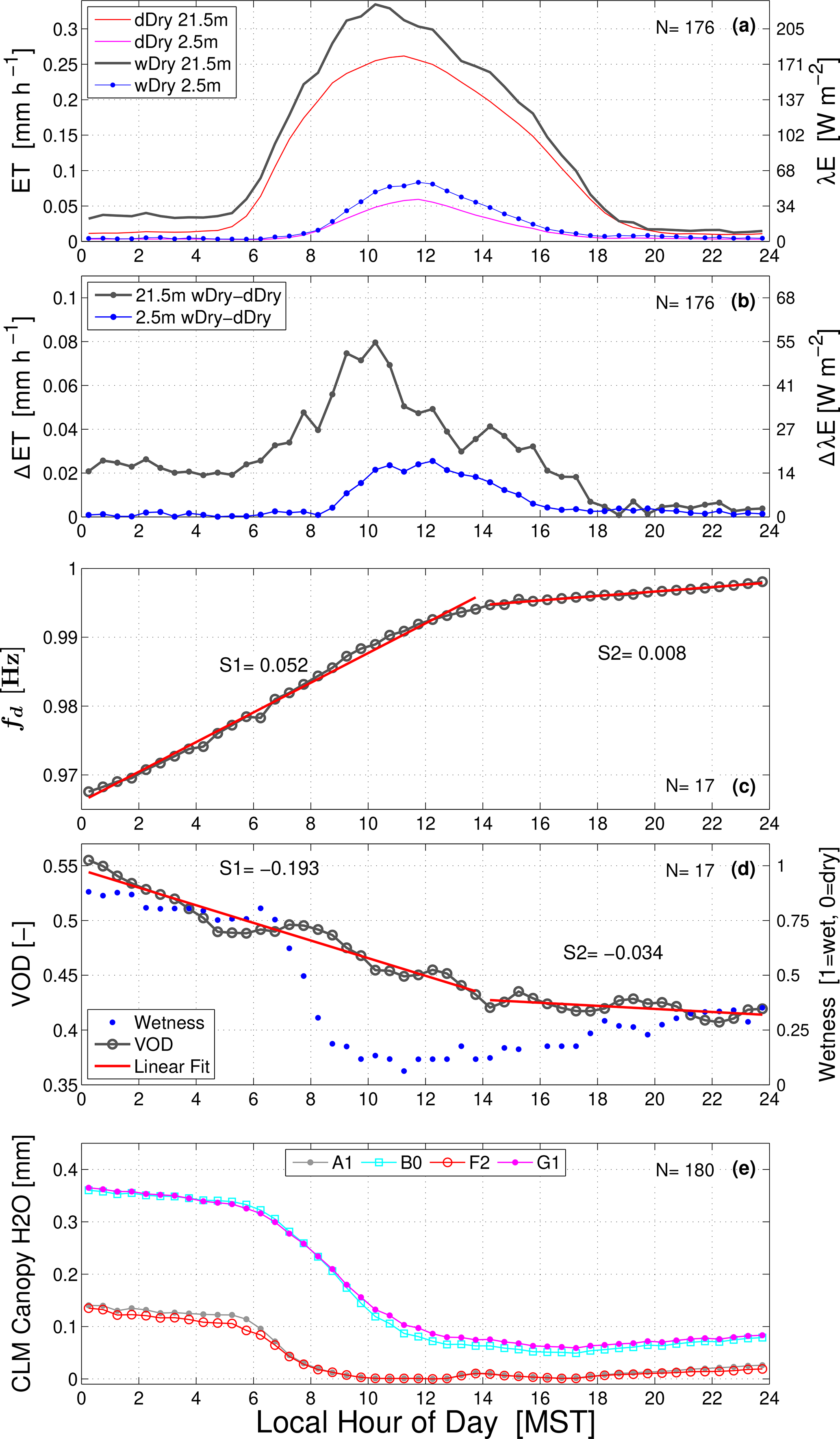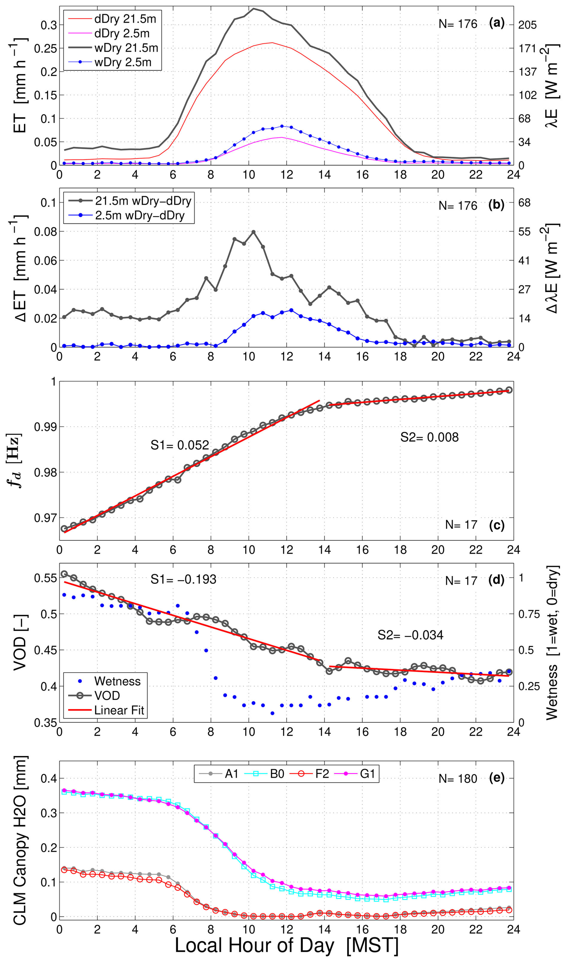 Figure 6The warm-season mean composite diel cycle of (a) evapotranspiration (ET) on wDry and dDry days at 21.5 and 2.5 m, (b) the ET difference between wDry and dDry conditions, (c) detrended tree sway frequency fd, (d) vegetation optical depth (VOD) and wetness, and (e) CLM4.5 values of the canopy-intercepted water content for the A1, B0, F2, and G1 cases (see Sect. 2.3 for case details). Panels (c)–(e) are for wDry conditions. Linear fits to fd and VOD before and after 14:00 MST are shown as red lines (the pre-14:00 MST slope is S1, and the post-14:00 slope is S2). In panels (a)–(b), the results are from the years 2004–2022 (N = 176 wDry days), while in panel (e) the CLM4.5 results are from the years 1999–2003 and 2006–2014 (as in Burns et al., 2018). For clarity, each panel lists the average number of days (N) used to create the composite.