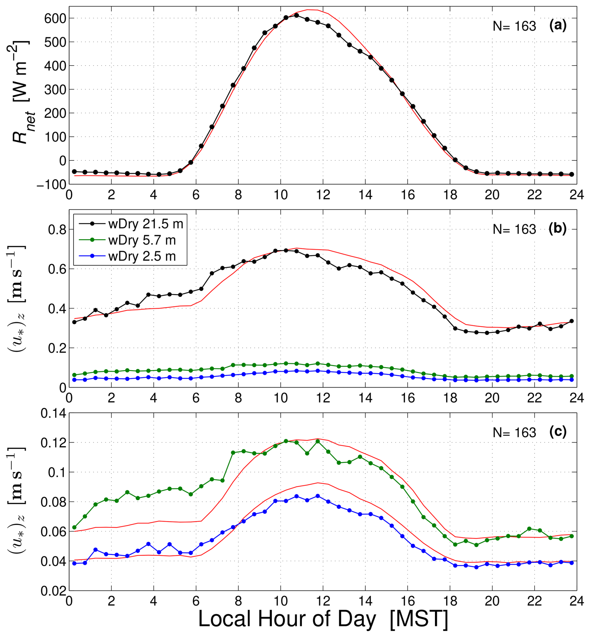 Figure 7The mean warm-season composite diel cycle of (a) net radiation Rnet, (b) local friction velocity (u∗)z at 21.5, 5.7, and 2.5 m (see legend), and (c) only showing subcanopy (u∗)z. The lines with solid circles are the diel cycle in wDry conditions, whereas the red lines are the corresponding diel cycle in dDry conditions. These results are from the years 2004–2022, where N is the number of wDry days, shown in the upper-right corner.