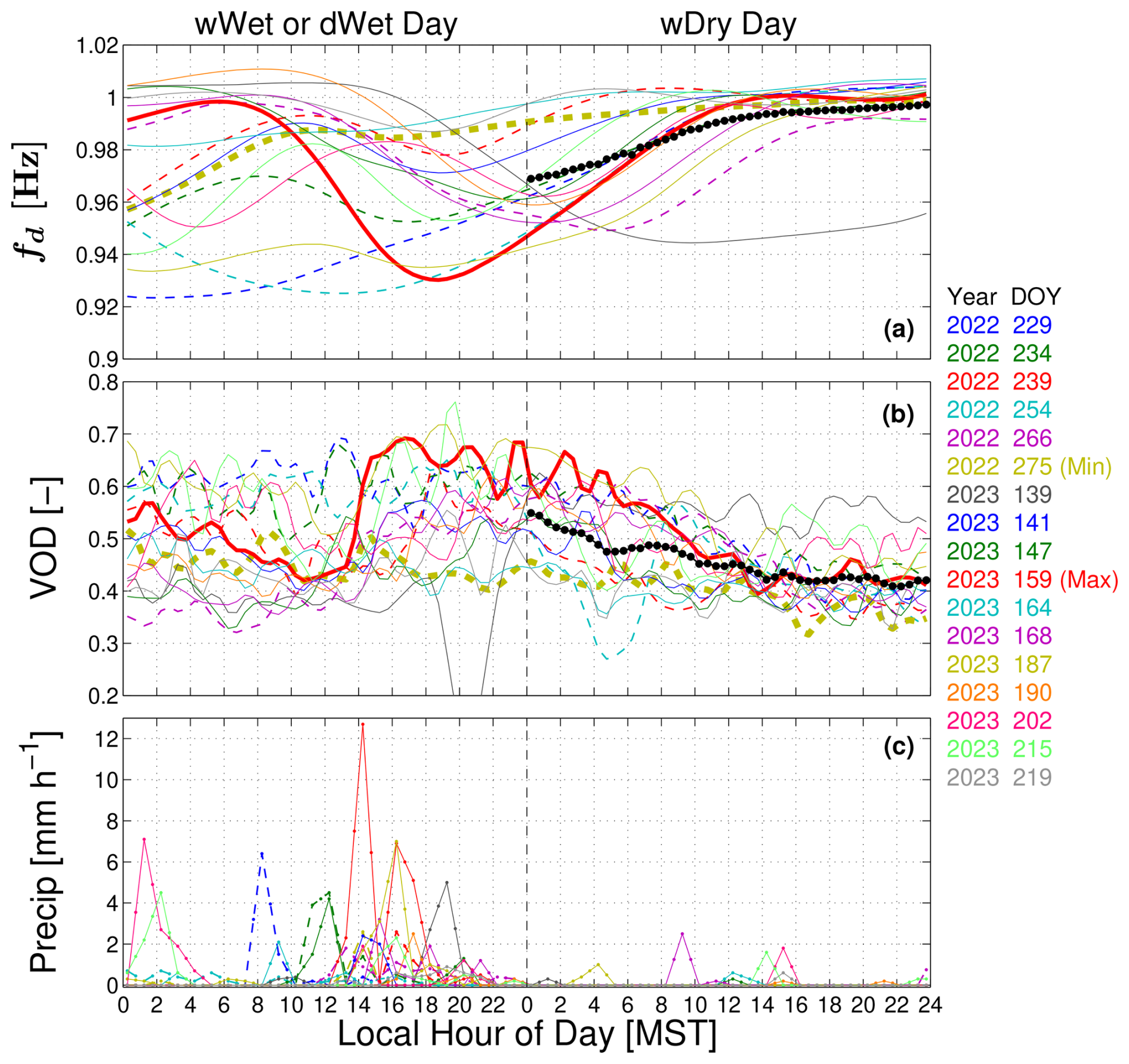 Figure 9The 2 d time series of the 17 wDry days from the warm season of 2022 and 2023 for (a) detrended tree sway frequency fd, (b) vegetation optical depth (VOD), and (c) precipitation. The time series of 30 min samples are centered on the start of the wDry day and include the time series from the wet day that precedes the wDry day. The color of each line is shown by year and day of year (DOY) of the wDry day to the right of the panels. The periods from 2022 are shown as dashed lines. The time series with the minimum and maximum wet day total precipitation are in bold and highlighted by the text as “(Min)” and “(Max)” in the right-hand list (see Table 3 for details). In panels (a) and (b), the composite wDry diel cycle from Fig. 6 is shown by the black line with filled circles.