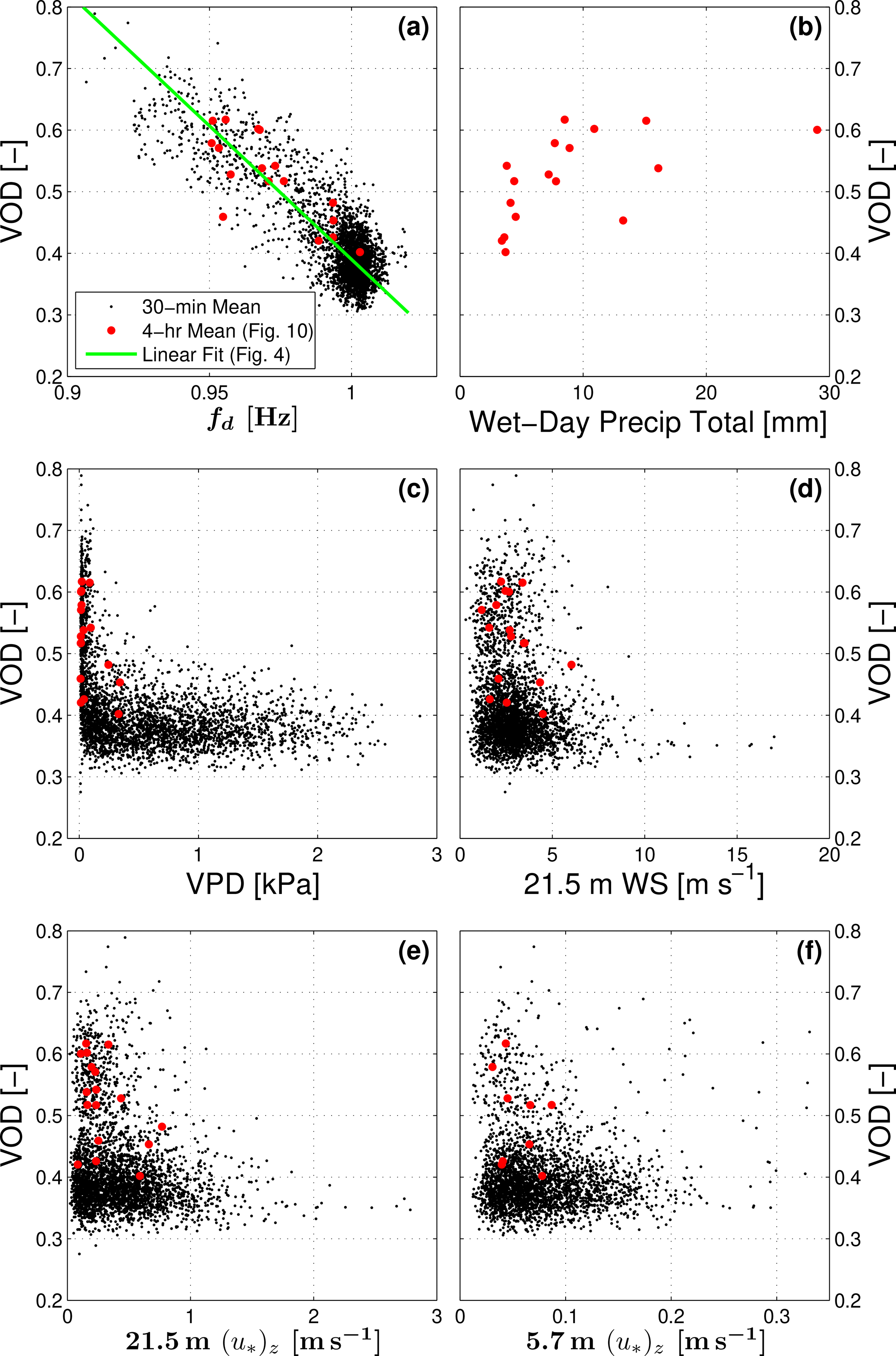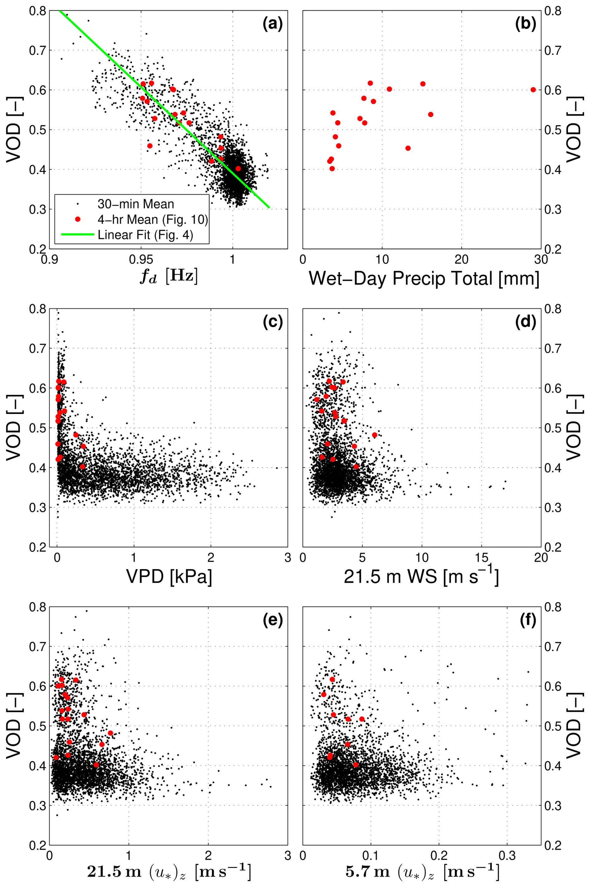 Figure 4The relationship between vegetation optical depth (VOD) and detrended tree sway frequency fd from the composite diel cycle shown in Fig. 3 is shown. For comparison, we have included VOD versus non-detrended tree sway frequency fsway (see legend); the red lines are linear fits with the fit coefficients using fd and fsway listed near each line.