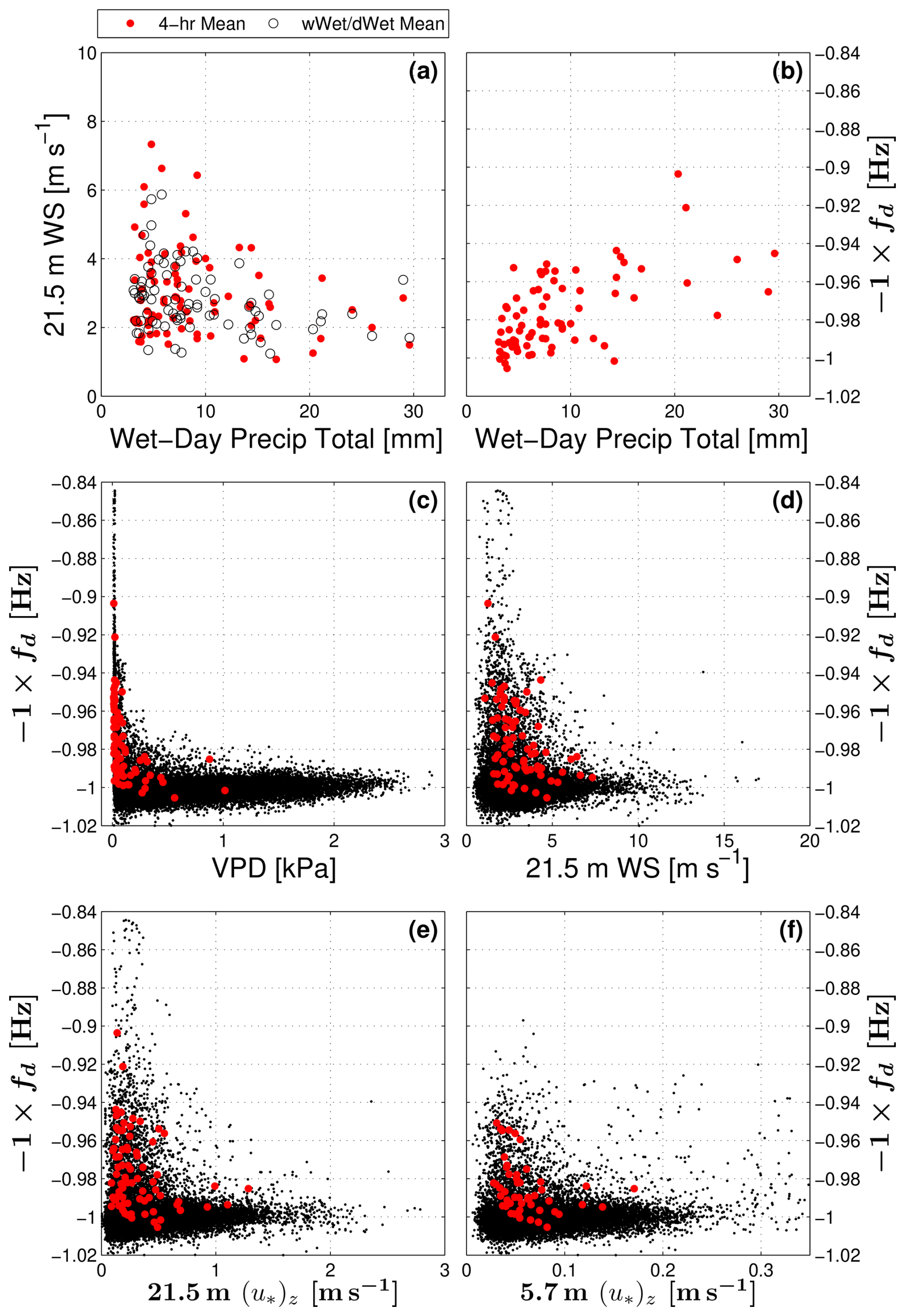 To study the impact of rainfall interception on the evaporative fluxes and VOD, we followed the methodology of Burns et al. (2015) and label days when the daily rainfall exceeded 3 mm as “wet” days. The choice to use 3 mm as the wet-day criterion was a balance between effectively capturing the effect of precipitation and providing enough wet periods to improve the wet-day statistics. To examine the effect of precipitation on VOD, ET, and the other variables we use the following strategy: first, we designate the precipitation state of the day of interest as either “Wet” or “Dry”, and we then indicate the preceding-day precipitation state with a lowercase letter (“w” for wet or “d” for dry) and create composite diel cycles for dDry (dry day followed by a dry day), dWet (dry day followed by a wet day), wWet (wet day followed by a wet day), and wDry (wet day followed by a dry day) days. Only 30 min periods when all variables of interest were available were used to create the diel cycle composites.