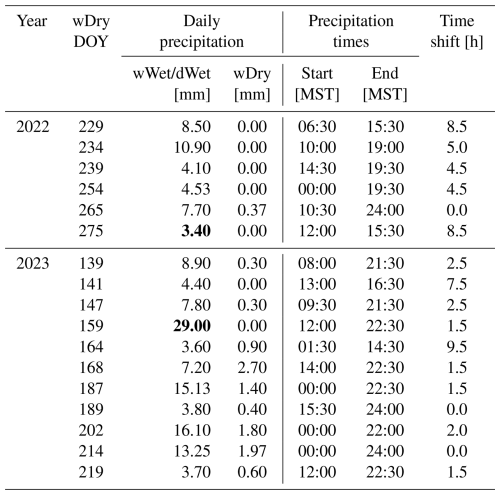 Unless otherwise noted, ET and all other statistics are calculated over 30 min periods. The sampling rates of the primary variables are listed in Table 1. To ease comparison with other studies (e.g., Klaassen et al., 1998; Humphrey and Frankenberg, 2023), we have expressed ET and the rate of precipitation in units of millimeters of H2O per hour (mm h−1).