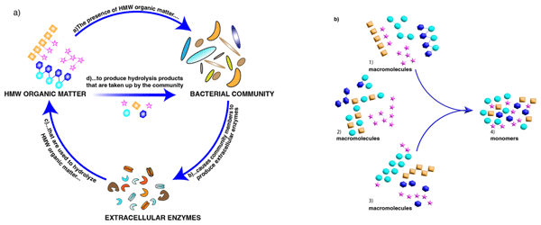 Figure 1(a) Key factors affecting biogeochemical cycling of high-molecular-weight (HMW) organic matter in the ocean: macromolecular structure, microbial community composition/capabilities, and the activities of the extracellular enzymes that process specific macromolecules. (b) Conceptual representation of three different groups of macromolecules (1–3) that could lead to the same pool of hydrolyzed monomers (4). Analysis of the monomers provides no information on the original sequence or 3D structure of the parent macromolecule(s) – structural features that are essential for enzyme-substrate fit.