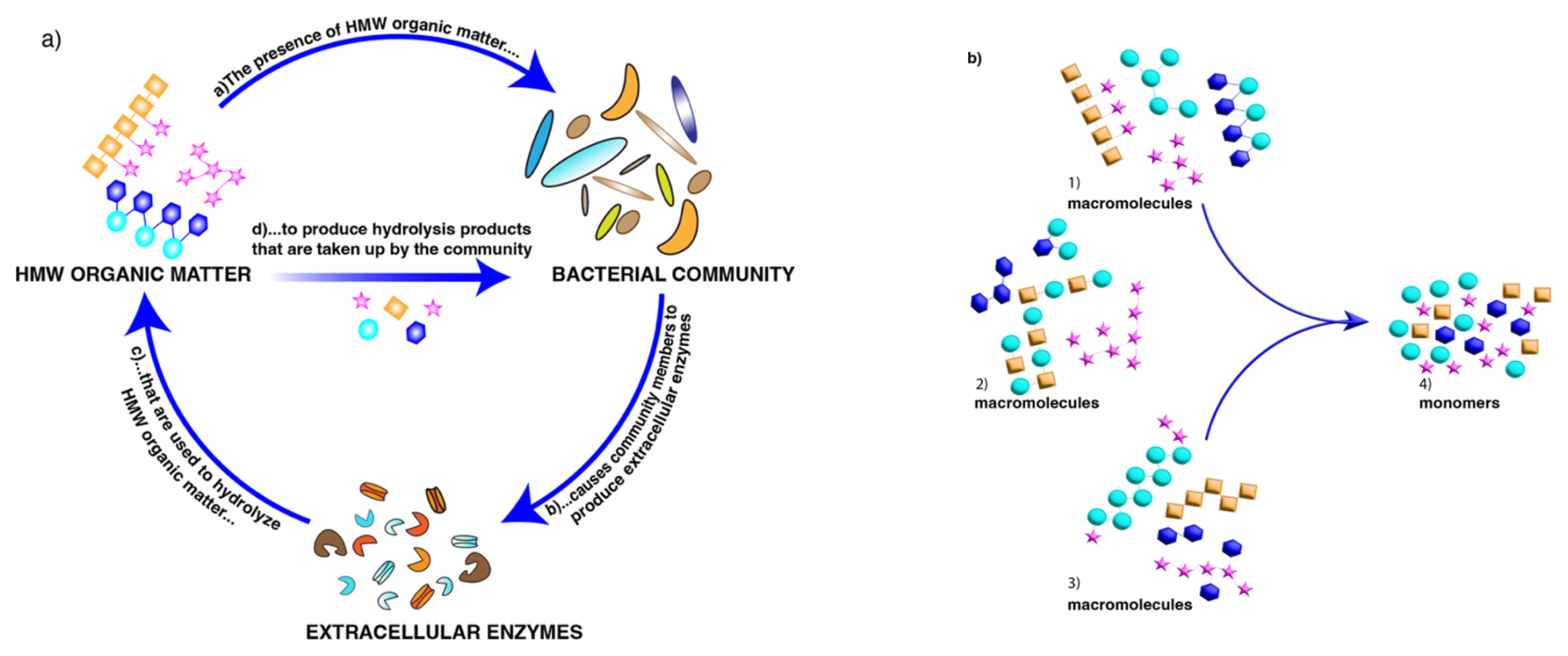 Polysaccharides and proteins are major macromolecular components of the phytoplankton-derived organic matter (Wakeham et al., 1997; Hedges et al., 2002) that forms the base of marine food webs. Much of this organic matter is processed by heterotrophic bacterial communities (Azam and Malfatti, 2007) that use structure-specific extracellular enzymes (Lombard et al., 2014) to hydrolyze high-molecular-weight (HMW) organic matter to sizes suitable for uptake (Fig. 1a). Since different community members possess distinct enzymatic complements (Avci et al., 2020; Krüger et al., 2019), the composition of a microbial community is an important determinant of a community's enzymatic capabilities. These community enzymatic capabilities vary with depth and location in the ocean (Arnosti et al., 2011; Steen et al., 2012; Hoarfrost and Arnosti, 2017; Balmonte et al., 2021). However, the cues to which these microbial communities are responding – in particular, the structure of the macromolecules that they sense and target – have to date not been well characterized.