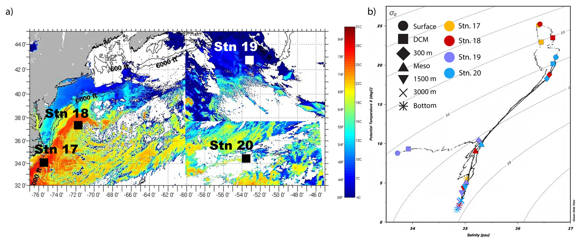 Figure 2Physical and chemical characteristics of sampling stations within the western North Atlantic. (a) Sea surface temperature, acquired by satellite imaging on/around the sampling day at each station (Rutgers University Coastal Observation Lab: RU-COOL satellite imagery, https://marine.rutgers.edu/cool/data/satellites/imagery/ (last access: 28 September 2022). (b) The temperature and salinity diagram of the four stations highlights the differences in the water masses sampled. Shapes denote the depths; colors denote the stations.