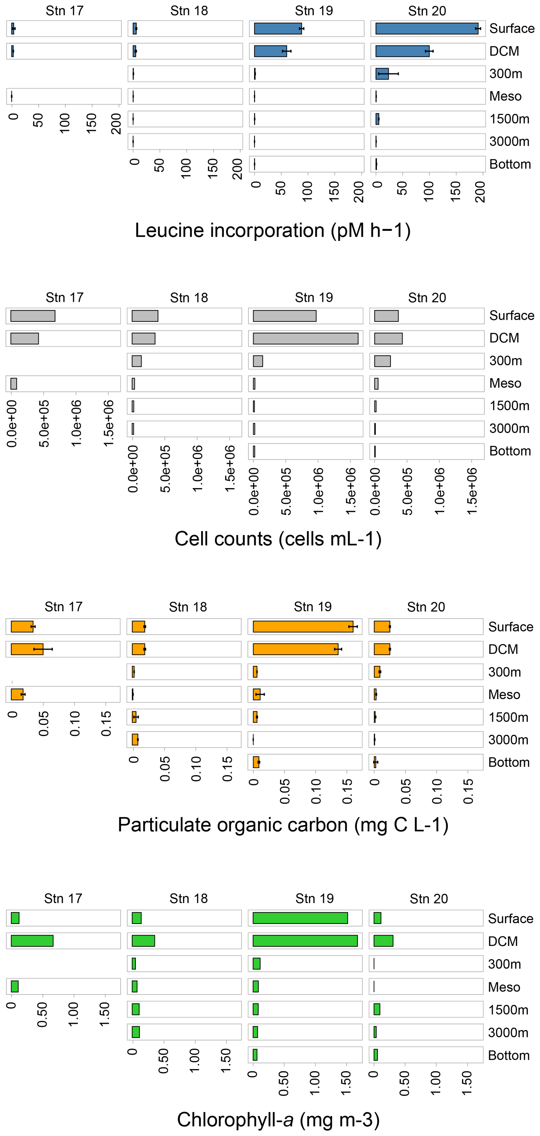 Bacterial protein productivity – as measured by incorporation of tritiated leucine – was highest in surface waters and decreased with depth. Bulk bacterial productivity (pmol leucine L−1 h−1) was highest at Stn. 20, where leucine was incorporated at ∼ 2 times the rate of Stn. 19; this trend holds true for all of the depths when comparing Stns. 19 and 20 (Fig. 3; Table S2). At Stn. 17, protein productivity increased slightly at the DCM compared to the surface, but was undetectable in bottom waters. At Stns. 18–20, bacterial productivity decreased considerably within the first 300 m of the water column, followed by a peak in productivity in lower mesopelagic waters at Stn. 18 and at 1500 m at Stns. 19 and 20, respectively. While bacterial protein productivity roughly doubled at this depth at Stns. 18 and 19, bacterial protein productivity increased even more, 11-fold to 5.5 pmol L−1 h−1 at this depth at Stn. 20. These peaks are followed by decreases in bacterial productivity with depth, and a slight increase again in bottom waters. Bulk bacterial protein productivity in bottom waters increased with distance offshore (Fig. 3; Table S2).