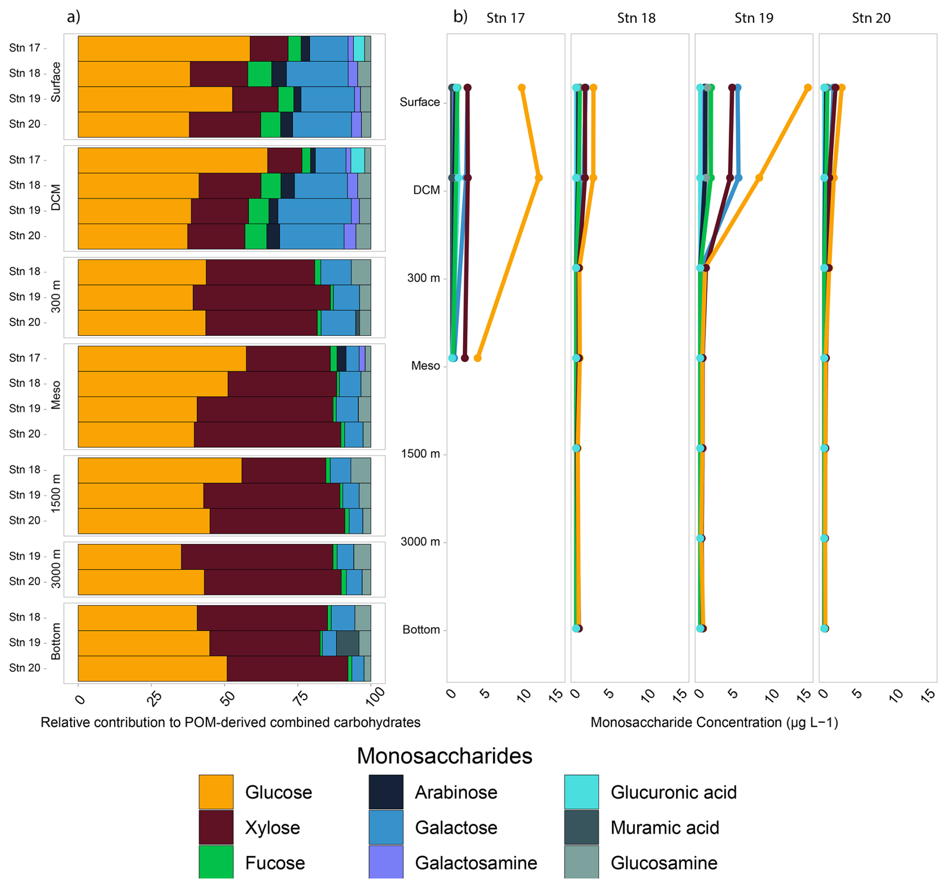 In the upper water column, total concentrations of monosaccharides contributing to combined carbohydrates differed somewhat by station (Fig. 4b; ANOVA, p=0.014). Stn. 19 had the highest concentration (∼ 28 µg L−1 in surface waters), consistent with the high chlorophyll fluorescence (Fig. S1) and high POC concentration at this station (Fig. 3). At Stns. 18 and 20, the concentrations were much lower (∼ 6 µg L−1). Stn. 17 (with a total water column depth of ca. 600 m) also had higher total concentrations in both surface and bottom waters as well as different monosaccharide constituents than at the other stations (Fig. 4). At Stns. 18–20, there were no station-specific differences in monosaccharide composition in waters below DCM (ANOVA, p=0.58).