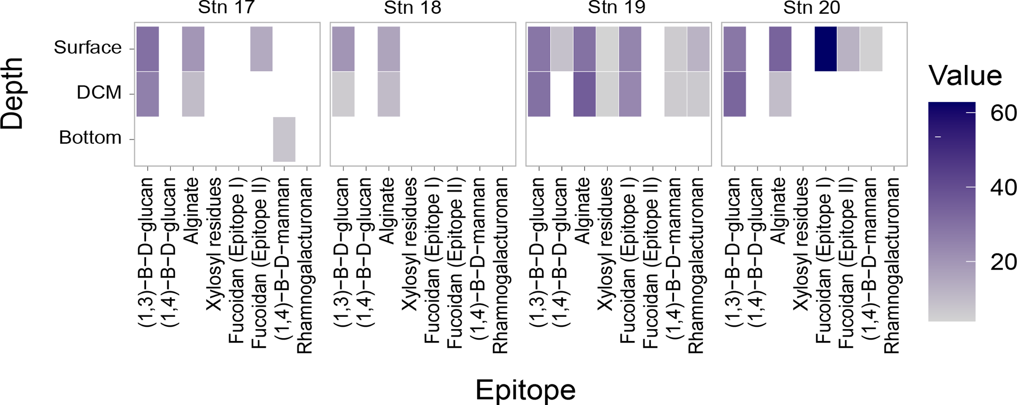 Figure 5Heatmap of polysaccharides detected from the carbohydrate microarrays. Darker shades represent a higher relative intensity, while lighter shades represent a lower relative intensity; white spaces represent samples where no epitopes were detected. Note that samples were collected at each depth horizon for all of the stations, but depths below the DCM and above bottom waters are not explicitly shown on the y axis in the figure, as no epitopes were detected in any of those samples.