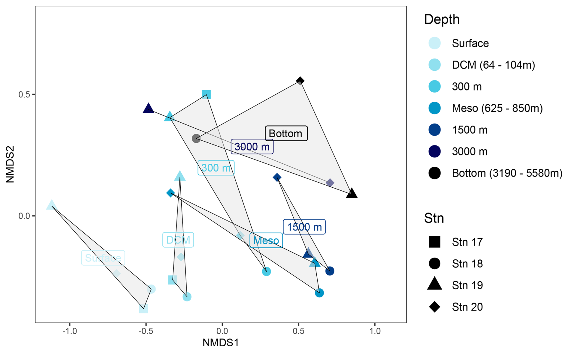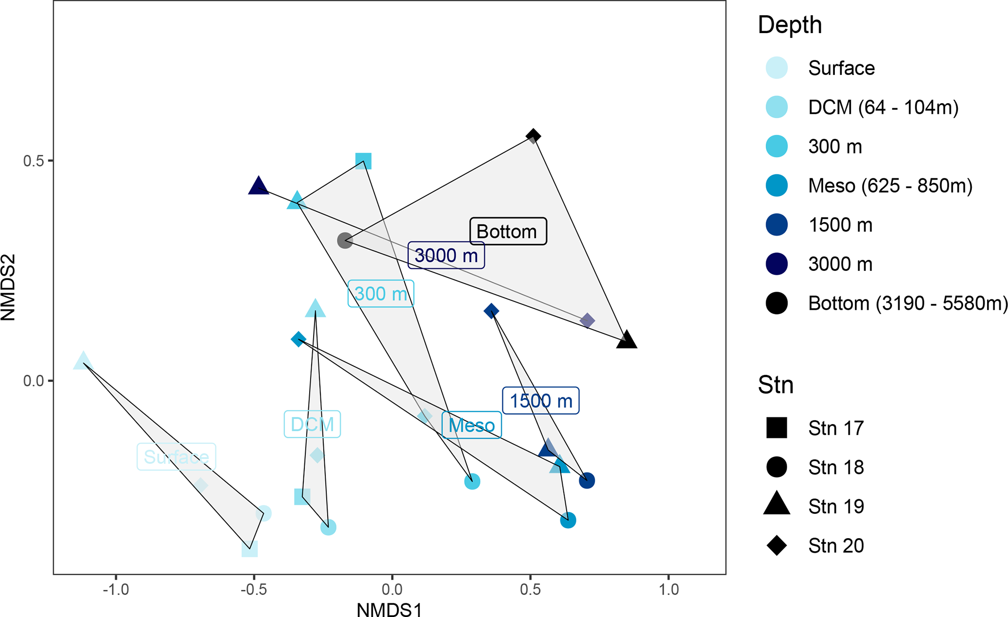 Figure 6Non-metric multidimensional scaling (NMDS) plots based on Bray–Curtis dissimilarity shows bacterial communities clustered by depth. Stations are represented by shapes; depths are indicated by colors (see the key). The grey-shaded regions in the NMDS plots represent the clustering of bacterial communities by depth.