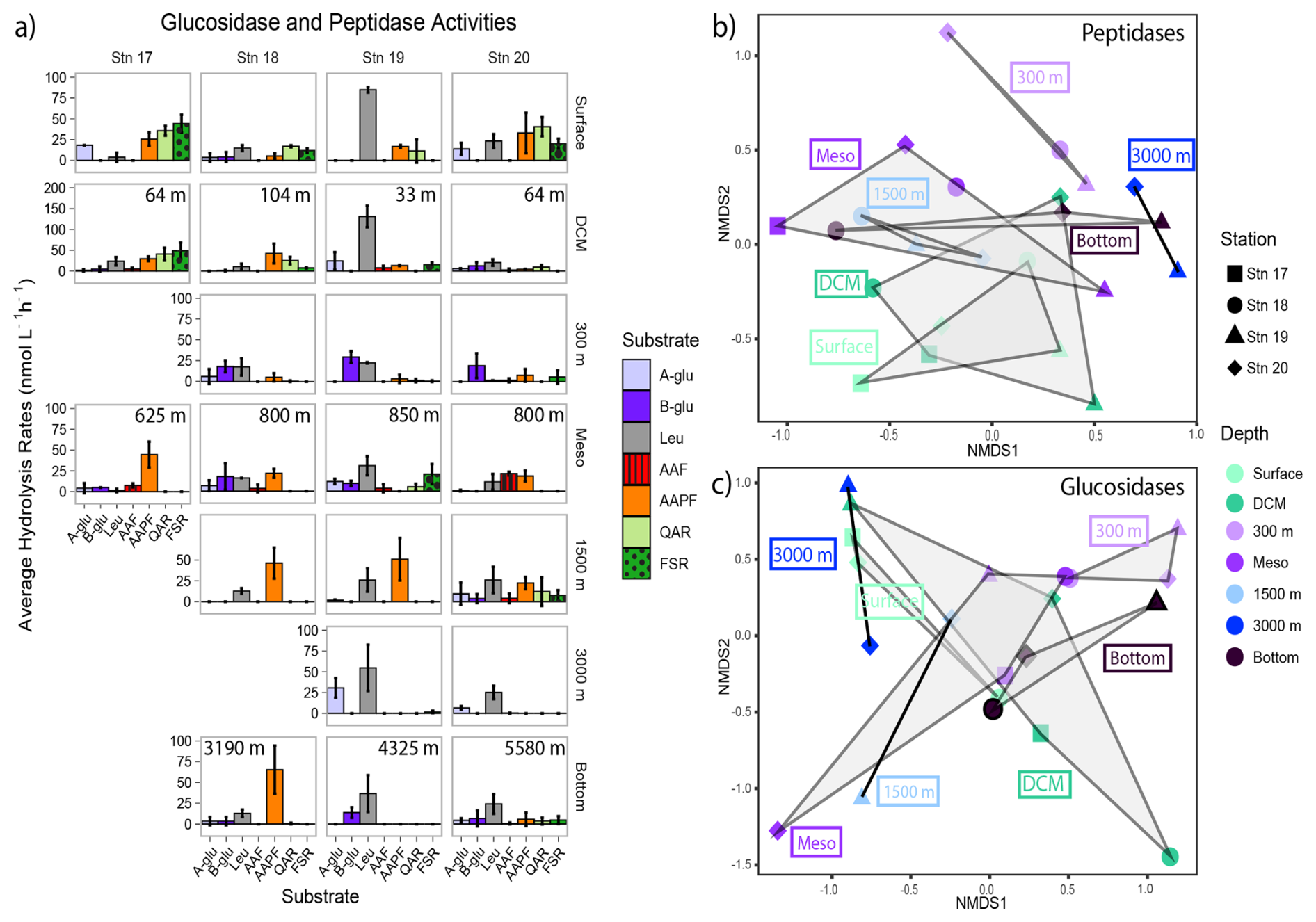 Figure 7(a) Average glucosidase and peptidase activities for each station and depth; error bars represent the standard deviation of activities measured over 12 h. Note that the y axes differ between each depth. A-glu: α-glucosidase; b-glu: β-glucosidase; leu: leucine aminopeptidase; AAF: alanine-alanine-phenylalanine; AAPF: alanine-alanine-proline-phenylalanine; QAR: glutamine-alanine-arginine; FSR: phenylalanine-serine-arginine. The NMDS plot based on Bray–Curtis dissimilarity shows (b) peptidase and (c) glucosidase activities clustered by depth. Shapes represent stations; colors represent depths. The shaded regions represent the grouping of enzyme activities by depth.