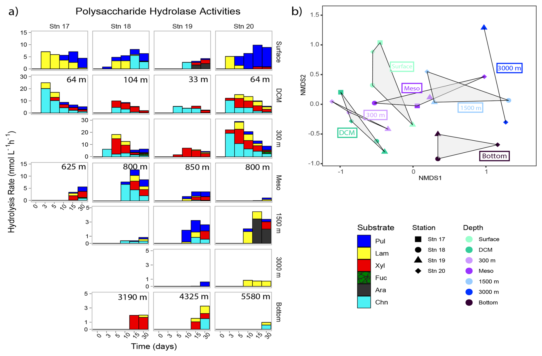 Figure 8(a) Polysaccharide hydrolase activities for each station and depth; the hydrolysis rates for each time point show when each substrate was hydrolyzed. Note that y axes differ between each depth. Pul: pullulan; Lam: laminarin; Xyl: xylan; Fuc: fucoidan; Ara: arabinogalactan; Chn: chondroitin sulfate. (b) The NMDS plot based on Bray–Curtis dissimilarity shows polysaccharide hydrolysis rates clustered by depth. Shapes represent stations; colors represent depths. The shaded regions represent the grouping of polysaccharide hydrolase activities by depth.