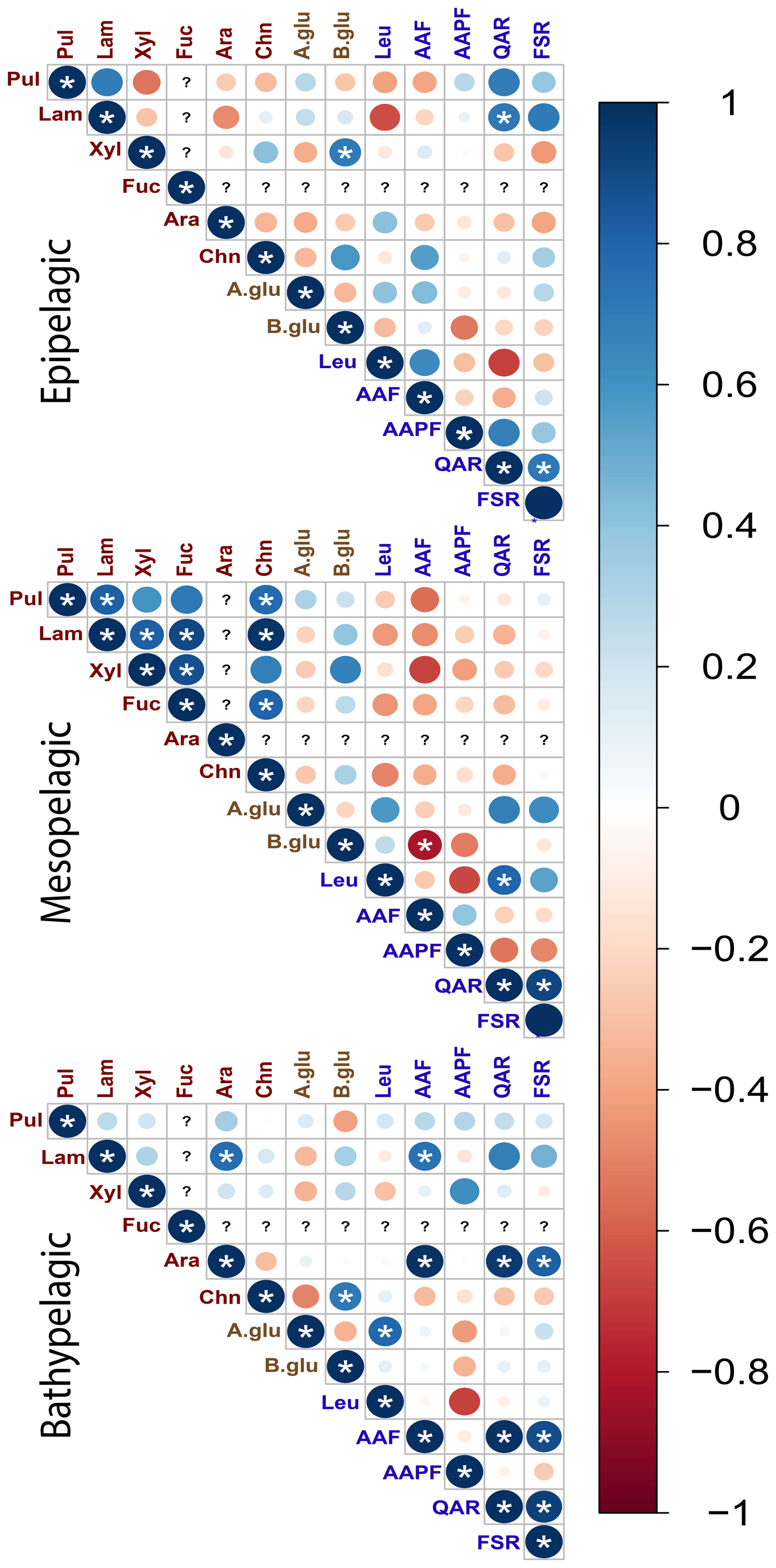 Figure 10Correlation plots displaying Pearson's correlations between enzymatic activities in different depth zones. Epipelagic zone: surface and DCM waters; mesopelagic zone: 300, , and 1500 m; bathypelagic zone: > 1500 m. Blue denotes positive correlations while red denotes negative correlations. The shade and size of the circle emphasizes the intensity of correlation between enzymatic activities. (?) for a given column or row represents a lack of data to assess a correlation for a given observation or measurement. * denotes statistical significance (p<0.05) after Bonferroni correction.