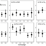 Cospectral analysis showed that Rh exhibited significant diurnal peaks with GPP and PAR across all campaigns, with stronger diurnal peaks during the growing seasons (C1, C4, and C5) and in C3 (Figs. 4g–r and 6a–l). Ra also exhibited significant diurnal peaks with GPP and both subdiurnal and diurnal peaks with PAR, particularly during C1 and C5 (Figs 5g–r and 7a–l). Although Ra-GPP cospectral power was slightly greater than that for Rh-GPP in C1 and C2, in C3–C6, Rh-GPP cospectral power exceeded that of Ra-GPP by a factor of 1.2 to 2.6-fold (p=0.047; one-way ANOVA).