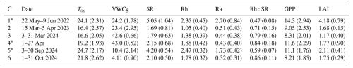 Table 1Site conditions and fluxes (means with standard deviations in parentheses) during the six measurement campaigns (C1–C6). Soil temperature (Ts5; °C) and volumetric water content (VWC5; %) at a depth of 5 cm, total soil respiration (SR; µmolm-2s-1), heterotrophic respiration (Rh; µmolm-2s-1), autotrophic respiration (Ra; µmolm-2s-1), the ratio of Rh to SR (Rh:SR; unitless), daylight-period gross primary productivity (GPP; µmolCO2m-2s-1), and leaf area index derived from MODIS (LAI; m2 m−2). Campaigns conducted during active growing seasons are marked with an asterisk ().