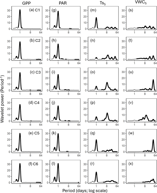 Figure 3Average wavelet power in the frequency domain (Period; time intervals from 6 h to 64 d) generated from the wavelet transformation of gross primary productivity (GPP; a–f), photosynthetically active radiation (PAR; g–l), soil temperature (Ts5m–r), and volumetric water content (VWC5s–x) at 5cm depth for six campaigns (C1–C6) at US-CRK. The bold contours indicate areas with significant coherence at the 5 % level against white noise.