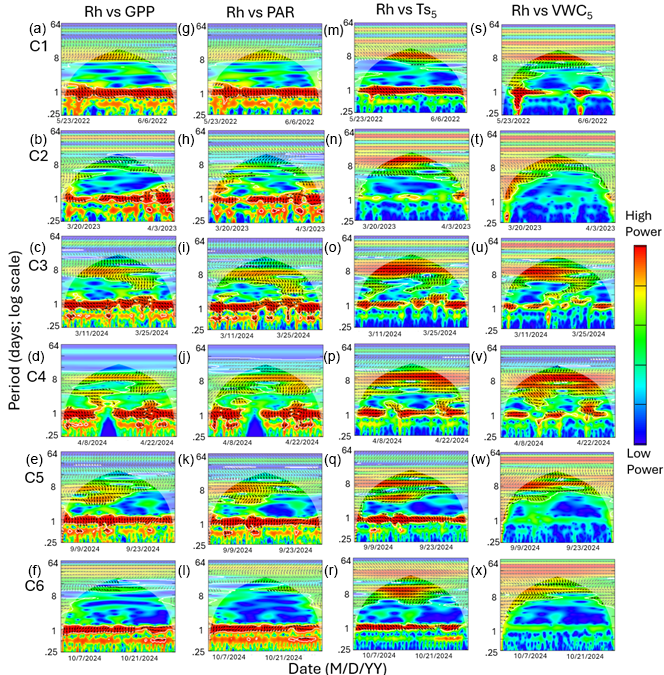 Figure 6Heatmaps of the cross-wavelet transformation (XWT) of heterotrophic respiration (Rh) against gross primary productivity (GPP; a–f), photosynthetically active radiation (PAR; g–l), soil temperature (Ts5m–r), and volumetric water content (VWC5s–x) at 5 cm depth for six measurement campaigns (C1–C6) at US-CRK. Arrows pointing to the right and left represent positive and negative correlations, respectively, without lag. Arrows pointing up-left (positive correlation) and down-right (negative correlation) indicate the response component lags behind the driver, while arrows pointing up-right and down-left indicate that the driver lags behind the response component. The 5 % significance level of the XWT analysis was generated within the cone of influence (COI) against white noise and identified by white contour lines. COI within the heat plot is identified with a light shade.