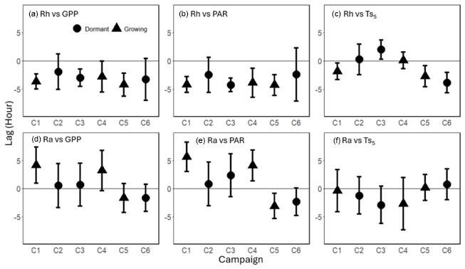 Figure 8Mean time lag (± standard deviation) between heterotrophic respiration (Rh) in relation to (a) gross primary productivity (GPP), (b) photosynthetically active radiation (PAR), and (c) soil temperature at 5 cm depth (Ts5), and between autotrophic respiration (Ra) with (d) GPP, (e) PAR, and (f) Ts5 at the diurnal frequency range (0.5 to 1.5 d) across six measurement campaigns (C1–C6). Phase differences were averaged over the diurnal frequency range and included only when the 1 d spectral peak was significant (p<0.1). Round dots represent dormant season campaigns, while triangles represent growing season campaigns. Positive lag values indicate that respiration preceded the corresponding driver, while negative values indicate that respiration lagged behind the driver.