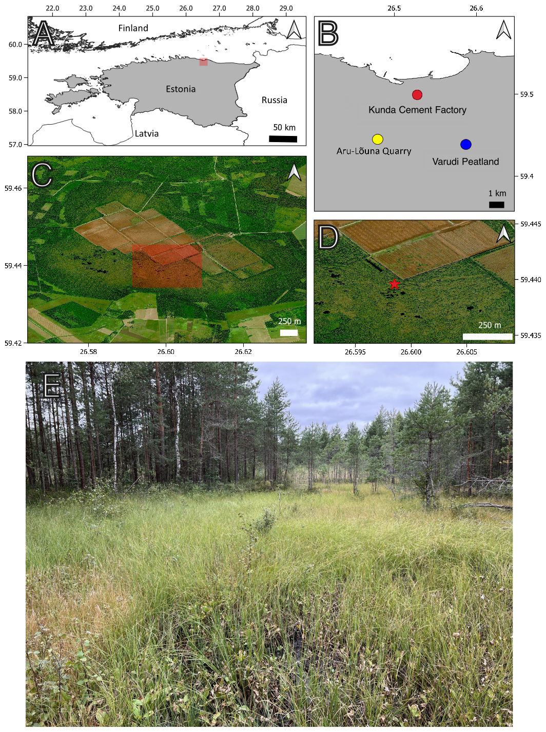 Figure 1Map of study locations. (A) Modern-day Estonia (in Gray). The red shaded square in map (A) indicates the area mapped in map (B). (B) Locations of sites relevant to this study (Kunda cement factory: Red, Aru-Lõuna Quarry: Yellow, Varudi peatland: Blue). (C) Satellite image of Varudi bog (© Microsoft) showing the extent of peat cutting and drainage that has taken place over the past century. The red shaded area indicates the area mapped in map (D). (D) Close-up of the location from where core VAR1 was recovered (red star). (E) Coring location.