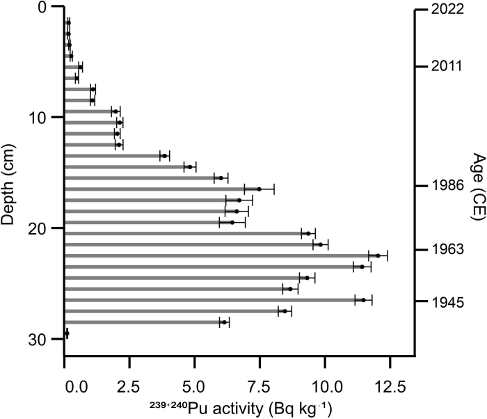The 239+240Pu activity profile reflects the history of atmospheric deposition at the site (Fig. 5). A clear peak at 28.5 cm corresponds to the onset of nuclear testing in 1945, followed by a second, larger peak at 22.5 cm, likely associated with the peak in global fallout from bomb testing in 1963, before the signing of the Partial Test Ban Treaty (Cwanek et al., 2021). Smaller peaks at 16.5 cm suggest possibly the 1986 Chernobyl fallout (Ketterer et al., 2004), and at 5.5 cm potentially originate from the 2011 Fukushima disaster (Bossew, 2013).