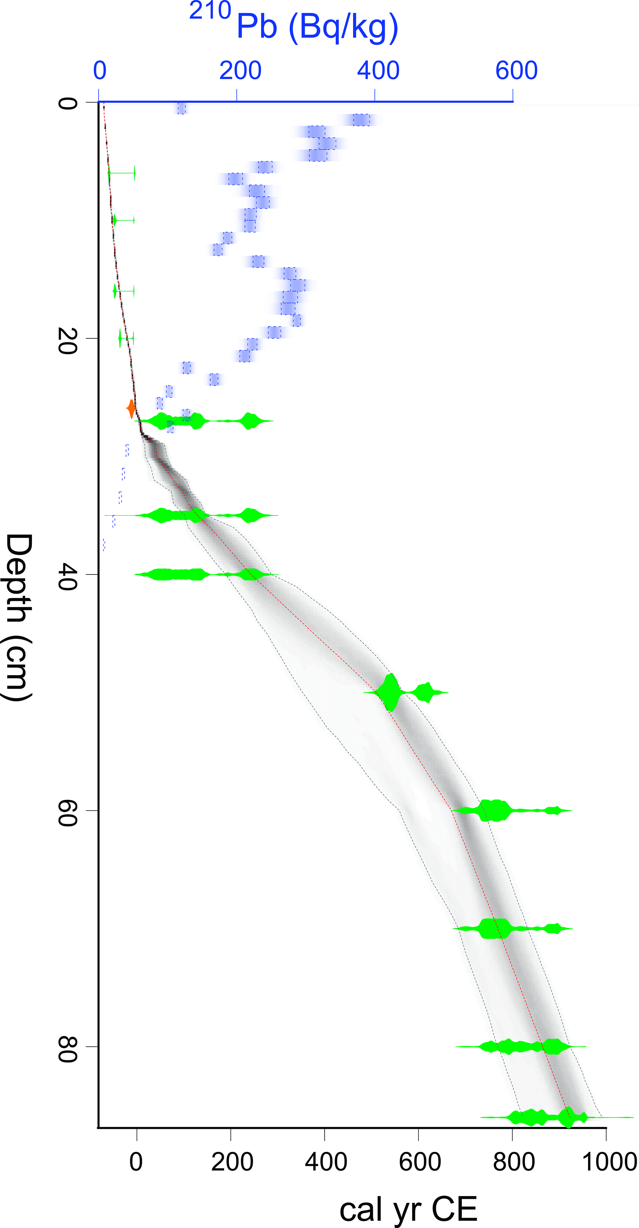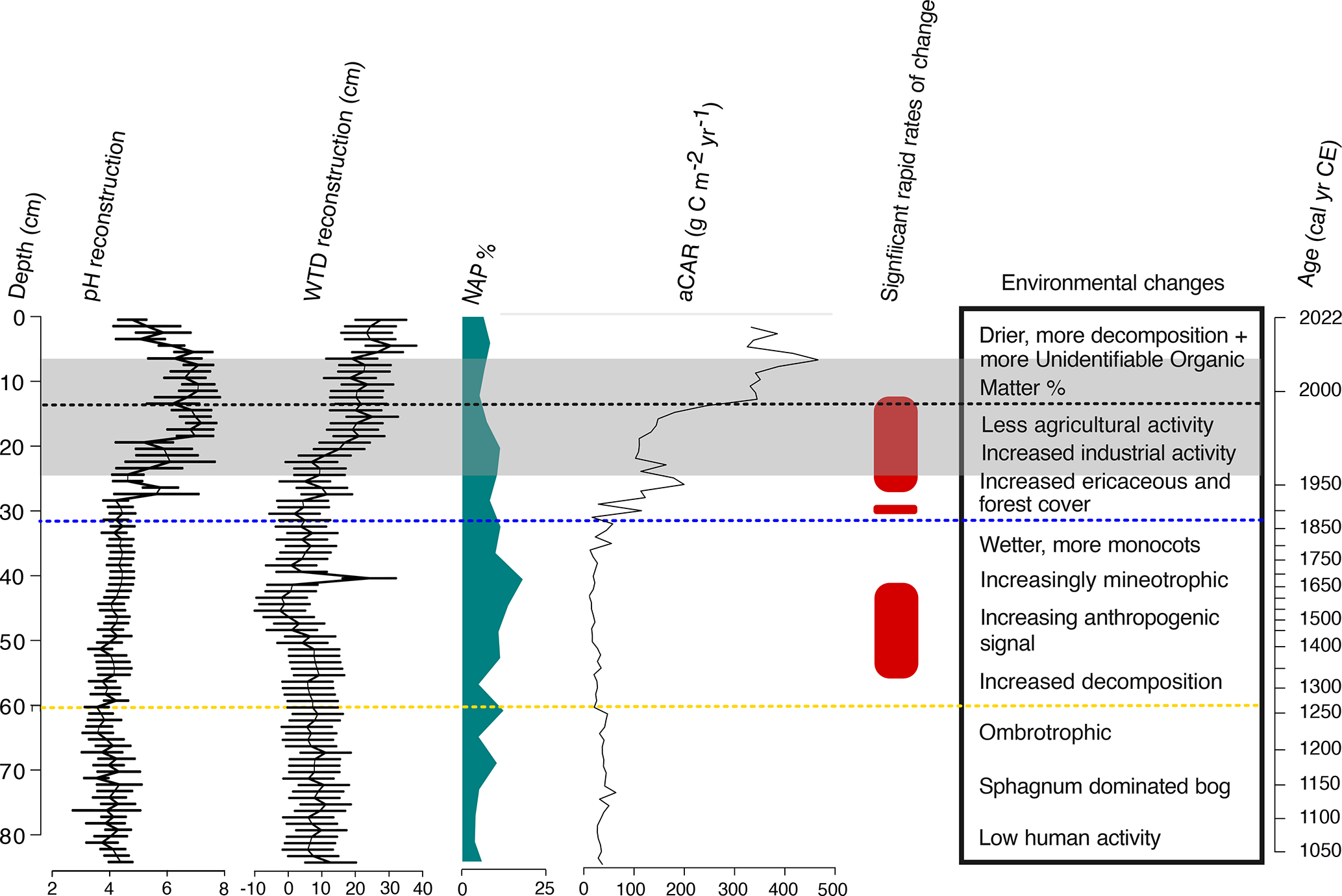 The resulting age-depth model (Fig. 6) indicates that peat accumulation rates were stable from the base of the core until around 1255 cal CE, after which accumulation slowed to around 0.22 yr cm−1, remaining low until around 1940 cal CE, where there was a sharp acceleration to ca. 2 yr cm−1.