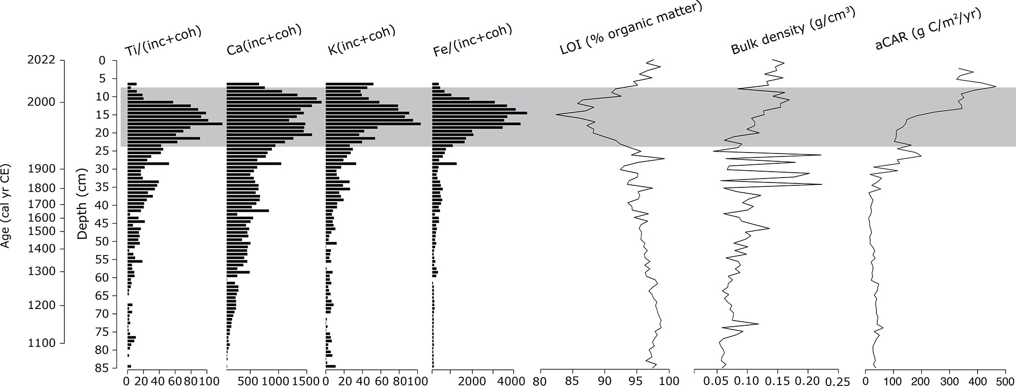 Figure 7Comparison of selected elements detected by the µXRF core scanner, as indicated by the PCA analysis, for the detection of dust fallout from the Kunda cement factory. In addition to peat physical property parameters: Loss on ignition (LOI %), bulk density and apparent carbon accumulation rates (aCAR). µXRF Data are presented as counts per second and normalised by dividing the sum of incoherent (inc) and coherent (coh) activities. The shaded area represents the section of core where most of the cement dust is concentrated. The uppermost aCAR sample was removed from the figure to aid interpretation.