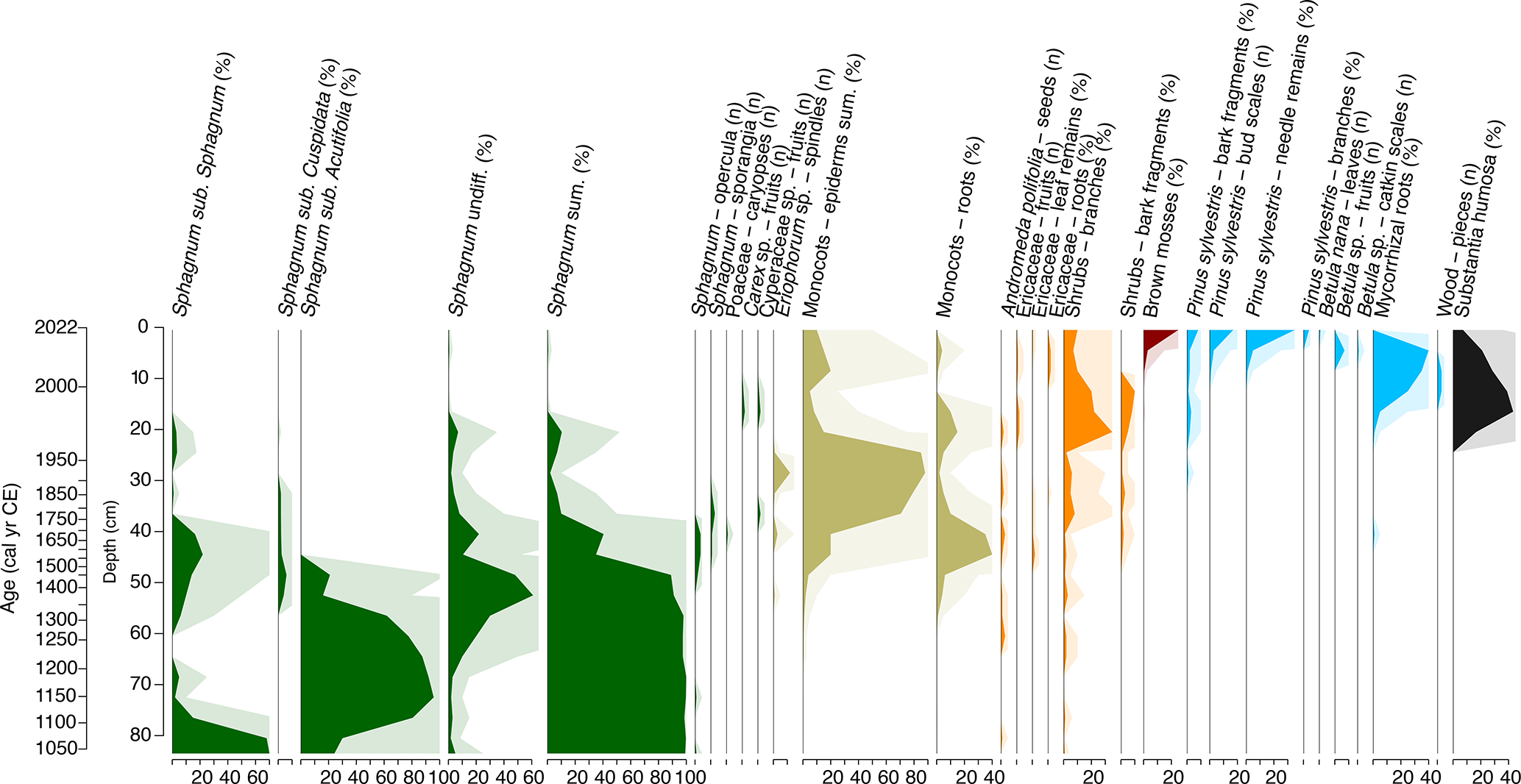 The latter portion of the record, starting ca. 1970 cal CE, is characterised by a shift towards more “woody” vegetation. Shrub-type taxa increase initially, followed by a rise in ligneous remains, particularly those of Pinus sylvestris. Mycorrhizal roots, bark fragments, and pine needles become significant components of the peat's botanical composition in the upper section. Betula is represented in the uppermost samples by its characteristic catkin scales and fruits, along with a Betula nana leaf recovered from the surface sample. This late phase is also characterised by a high percentage of unidentified organic material. At the top of the core, remains of the brown moss Tomentypnum nitens, characteristic of calcareous fens, were identified (Hájek et al., 2021).