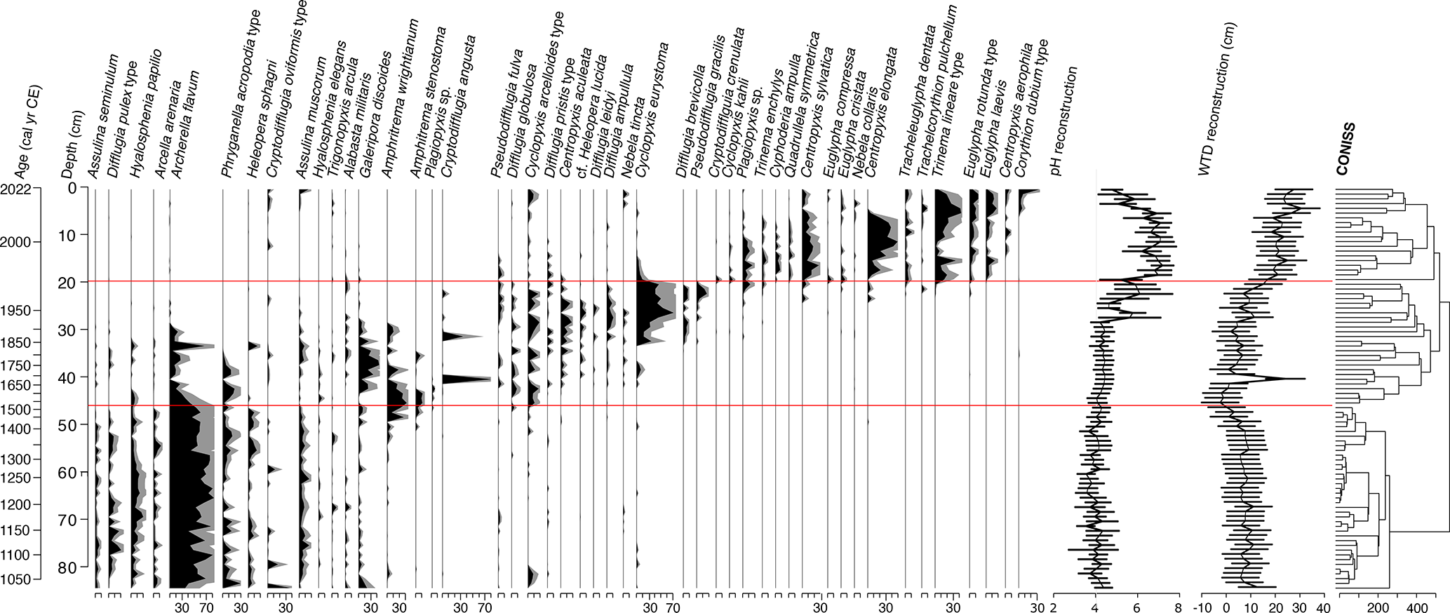 The first zone, extending from the base of the core to 44.5 cm (ca. 1600 cal CE) is characterised by a mix of proteinaceous and mixotrophic species, including Archerella flavum and Hyalosphenia papilio. Other abundant species in this zone include Difflugia pulex, Phryganella acropodia, Assulina muscorum and Assulina seminulum. The second zone, ending at 19.5 cm (ca. 1980 cal CE), shows a replacement of the dominant species by Galeripora discoides, Amphitrema stenostoma, and xenosomic species such as Cyclopyxis arcelloiodes. By 35.5 cm (ca. 1821 cal CE), mixotrophic species have almost disappeared, replaced by Cyclopyxis eurystoma, Centropyxis aculeata, Difflugia ampullula, Difflugia brevicolla and Pseudodifflugia gracilis. The final zone, at the top of the core, is dominated by Centropyxis elongata, Centropyxis sylvatica, Plagiopyxis sp., Euglypha rotunda type, and Euglypha leavis.