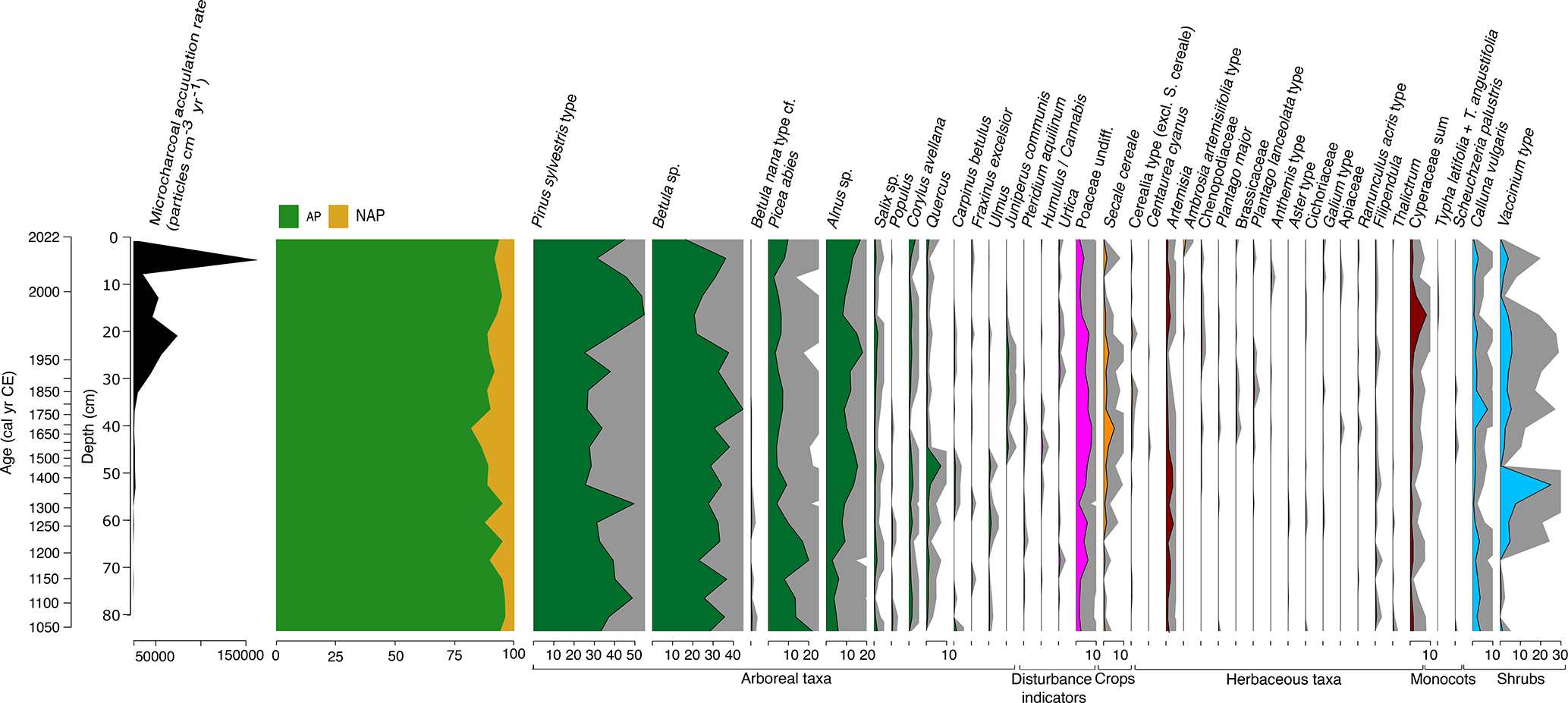 In addition to pollen counts, microscopic charcoal particles (10–100 µm) were counted from pollen slides as past fire activity, both natural and anthropogenic (Finsinger and Tinner, 2005), while spheroidal carbonaceous particles (SCPs) counted as indicators of industrial activity (Patterson et al., 1987; Swindles, 2010). Microcharcoal concentrations per cm3 were calculated by dividing the number of particles counted with the number of Lycopodium spores and multiplying this by the total number of particles counted, and accumulation rates (reported as particles cm−3 yr−1) were calculated by dividing the microcharcoal concentration with the rPlum-derived age increments per cm slice.